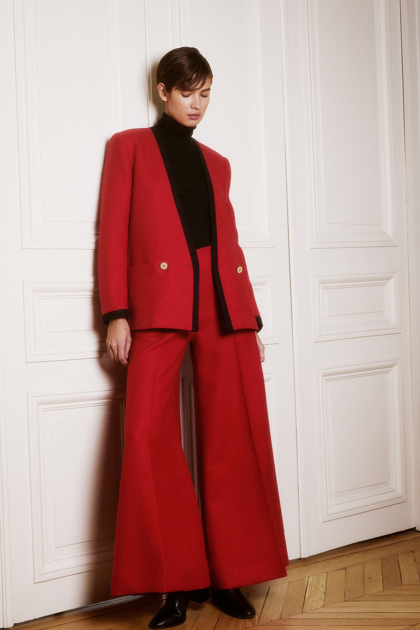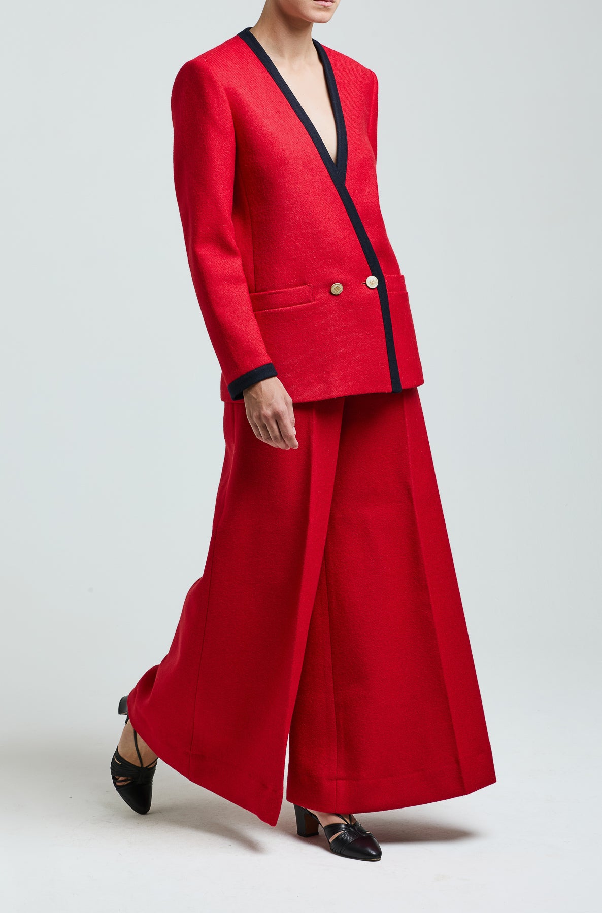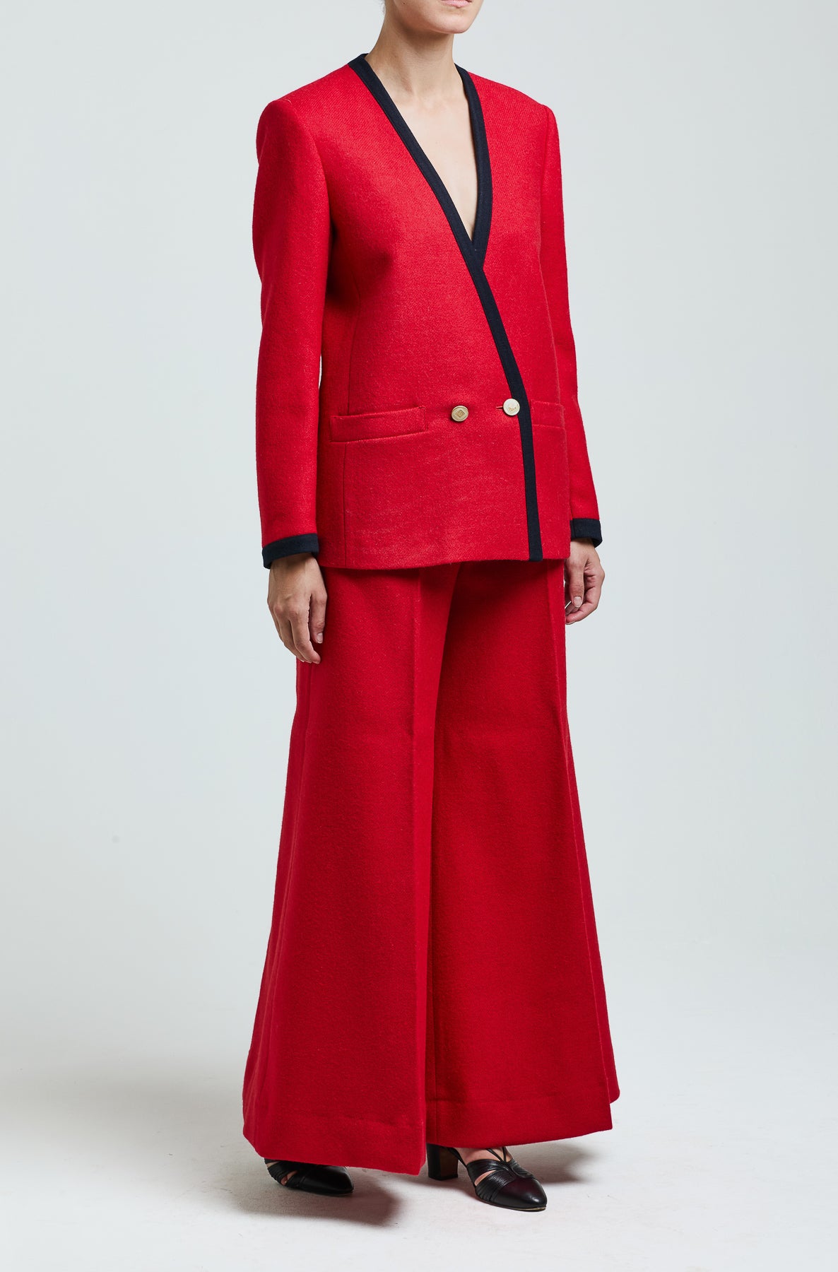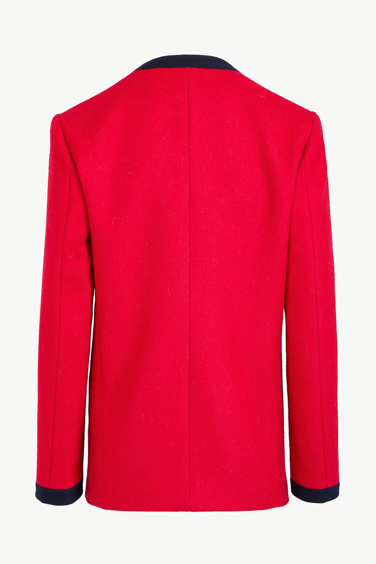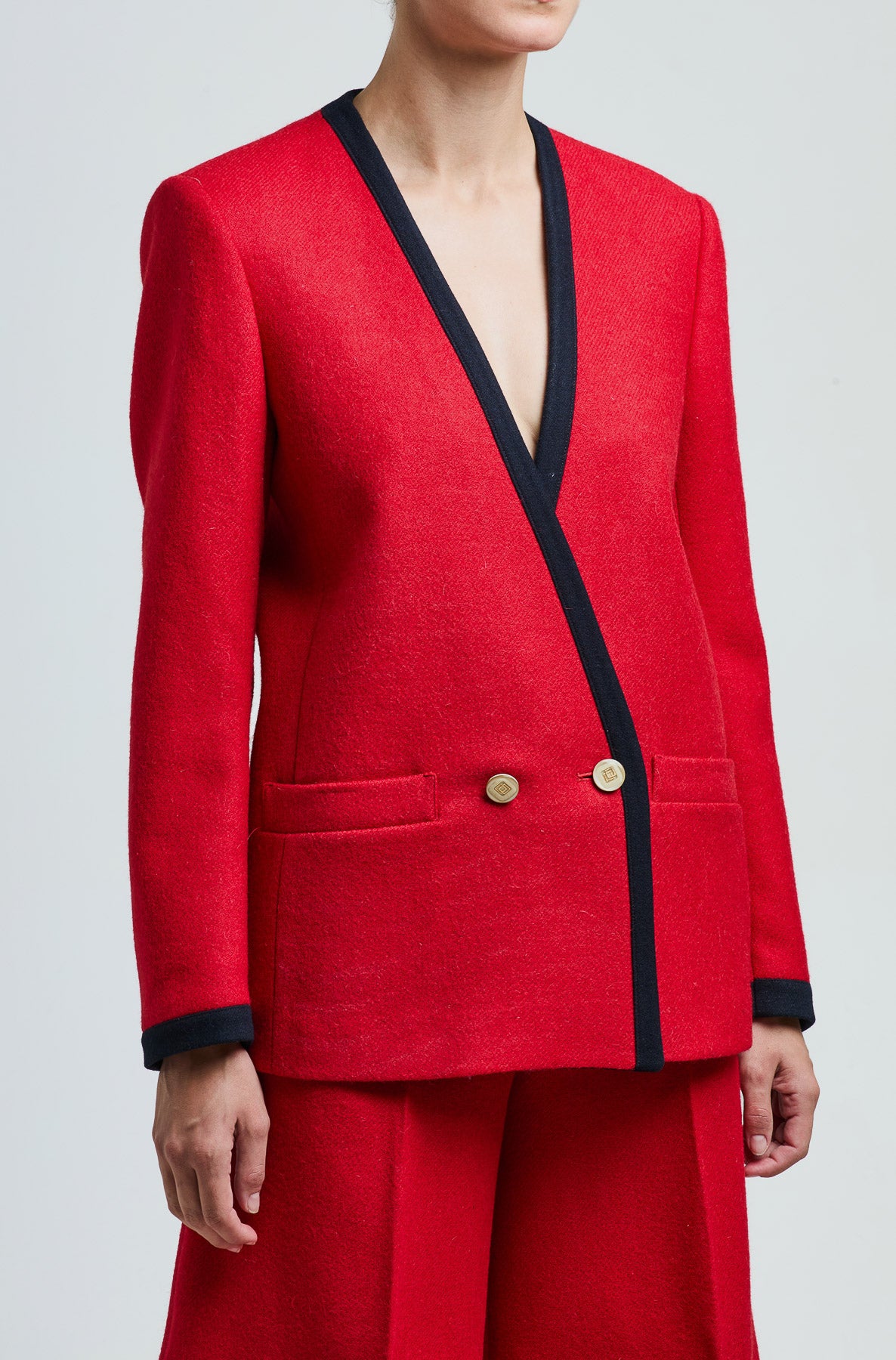 Tailored double-breasted blazer in pure navy wool with contrasting buttons and with no lapels. A pared-back take on the Charlotte style, streamlined, sharp, and quietly essential.