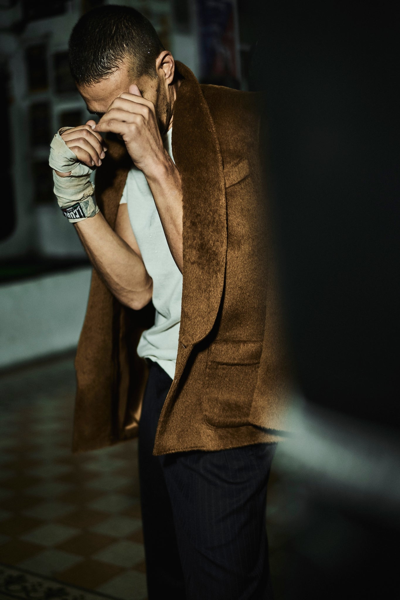 Tailored from brown wool drill cloth, the Remo trousers balance tradition with a slightly offbeat edge. They feature front pleats, a mid-rise waistband, and distinctive slanted flap pockets that fasten with contrasting buttons. Finished with a sharp crease and left unhemmed in true tailoring tradition, they are designed to be adjusted to the wearer’s ideal brea