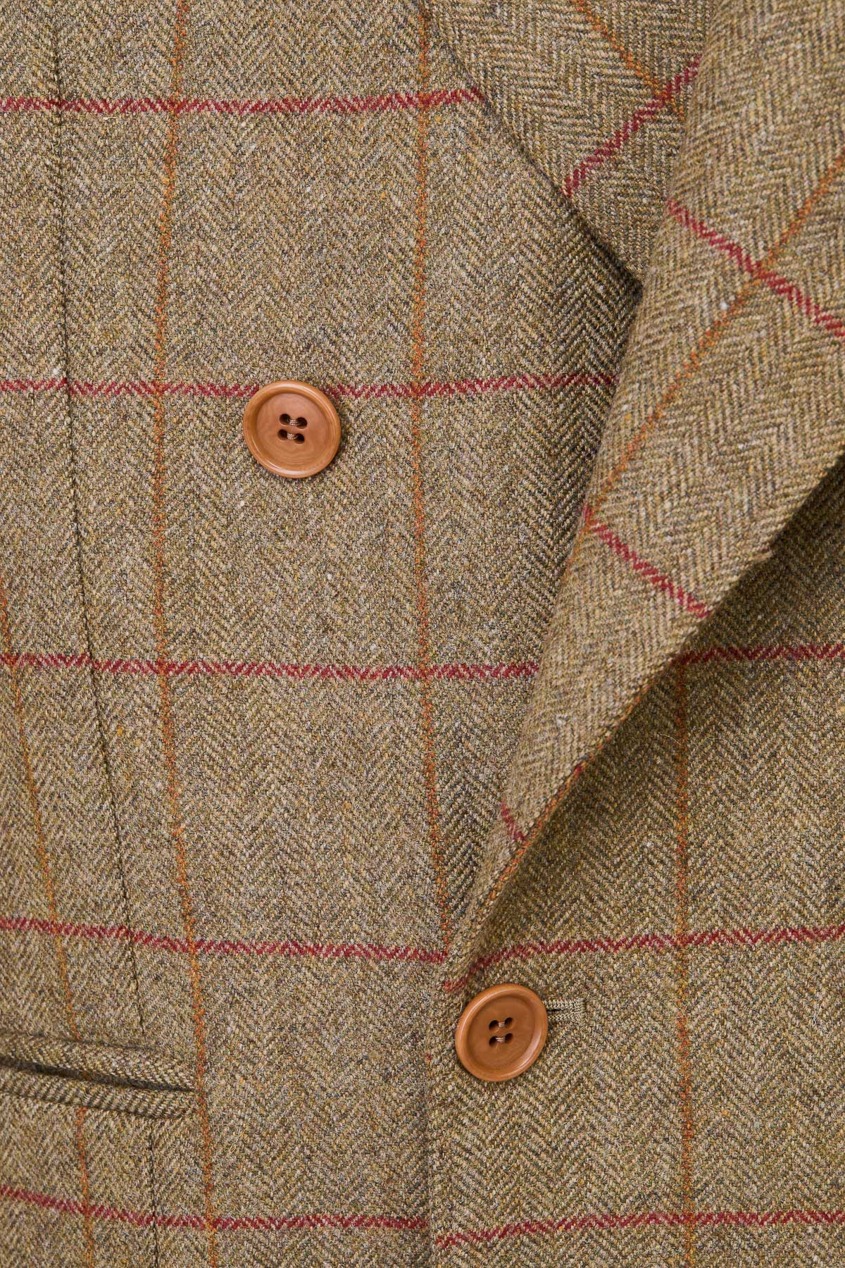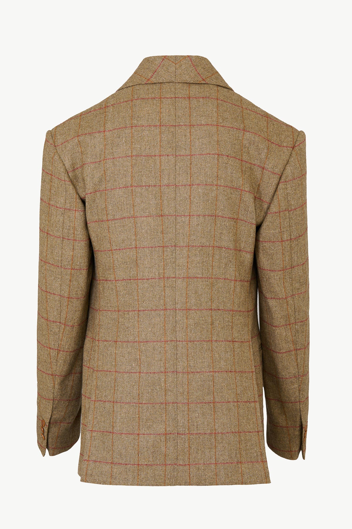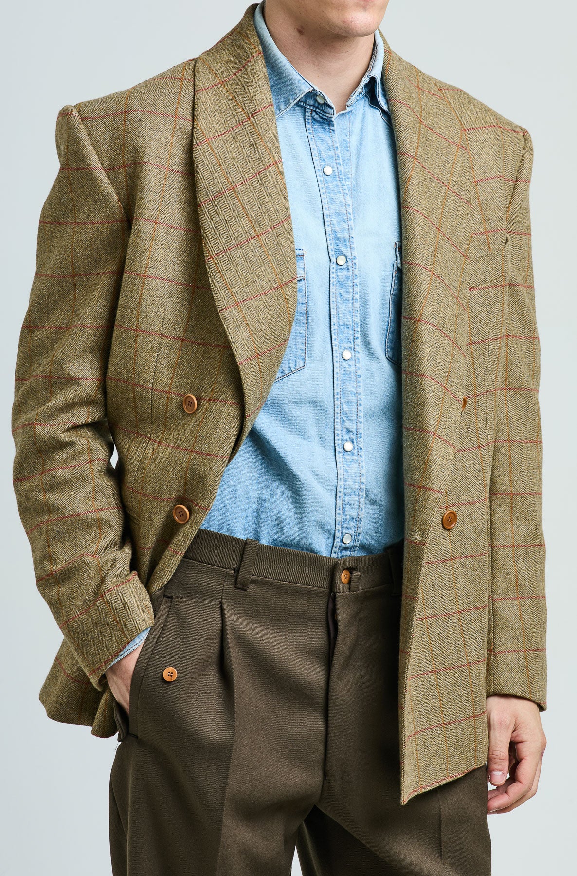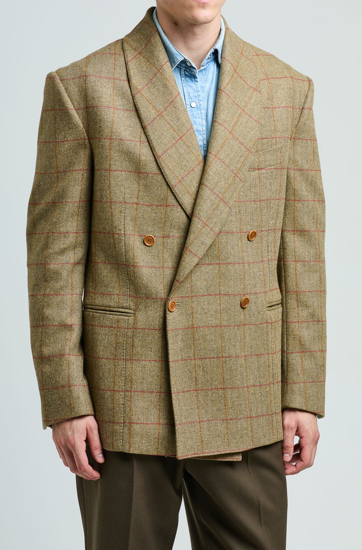Our David blazer is a double-breasted jacket in checked green wool with a subtle red check. It features a generous shawl lapel, a four-button front, besom pockets, double back vents, and three-button cuffs. The sharp, structured cut contrasts with the playful tone of the fabric, a confident choice for cool-weather dressing.