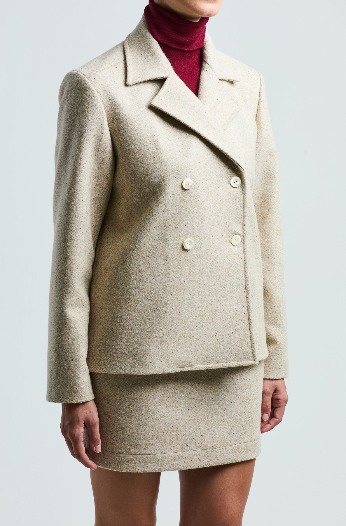 The Agata Jacket is a double-breasted style crafted in virgin wool felt. It features a cropped, straight silhouette with sharp lapels and front button fastening. Fully lined for comfort, it is designed to be worn on its own or paired with the matching mini skirt.