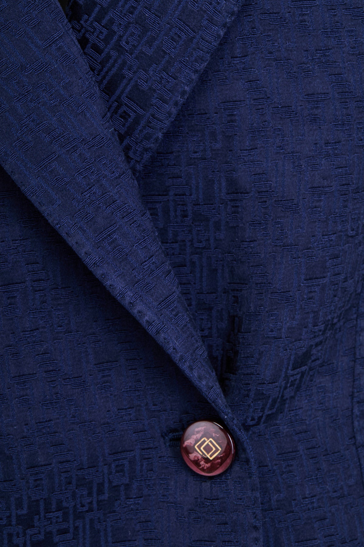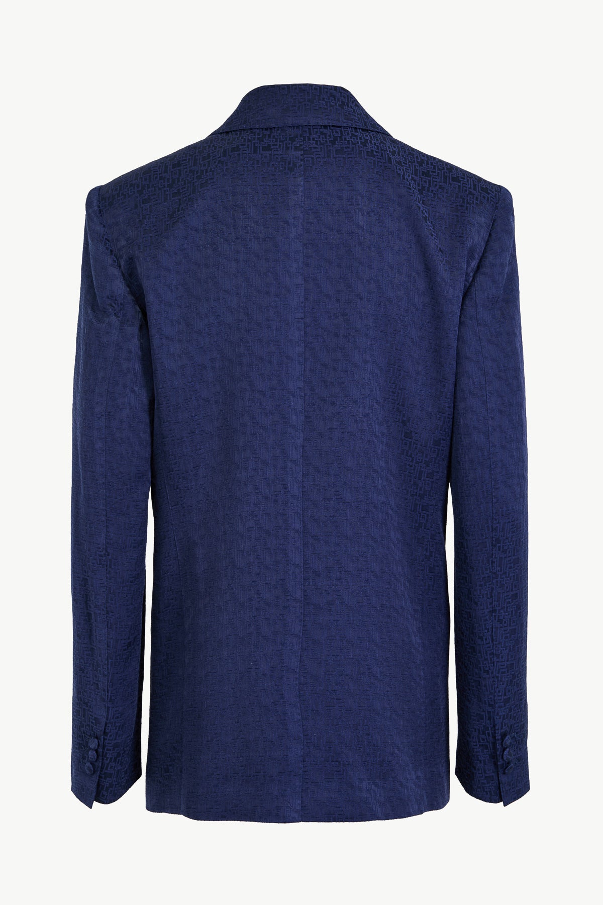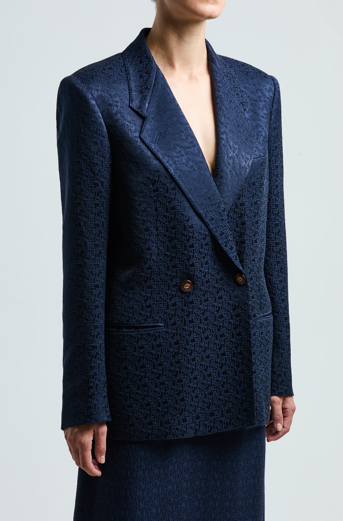 The Anna Blazer is tailored from a silk and viscose blend jacquard in midnight blue, featuring a subtle geometric motif. Cut in a double-breasted silhouette, it includes notch lapels, front welt pockets, and tonal buttons. Lightly structured shoulders and full lining ensure a refined fit and smooth drape.