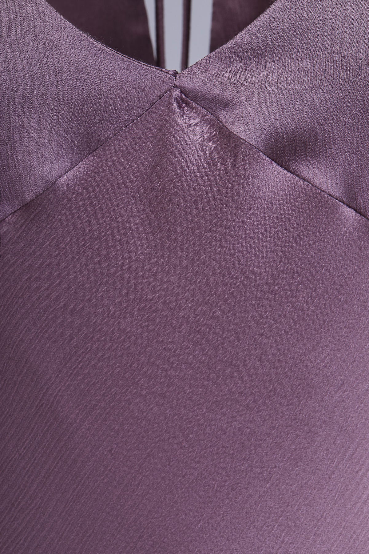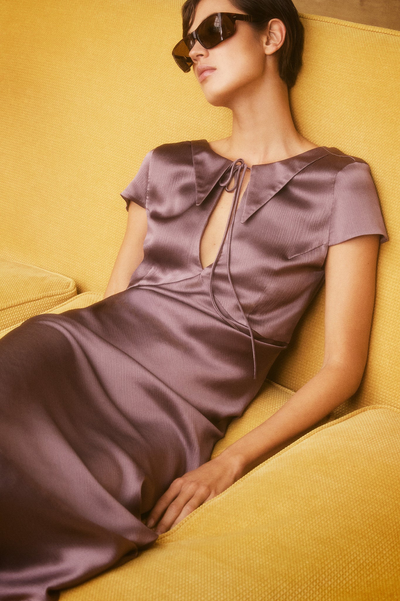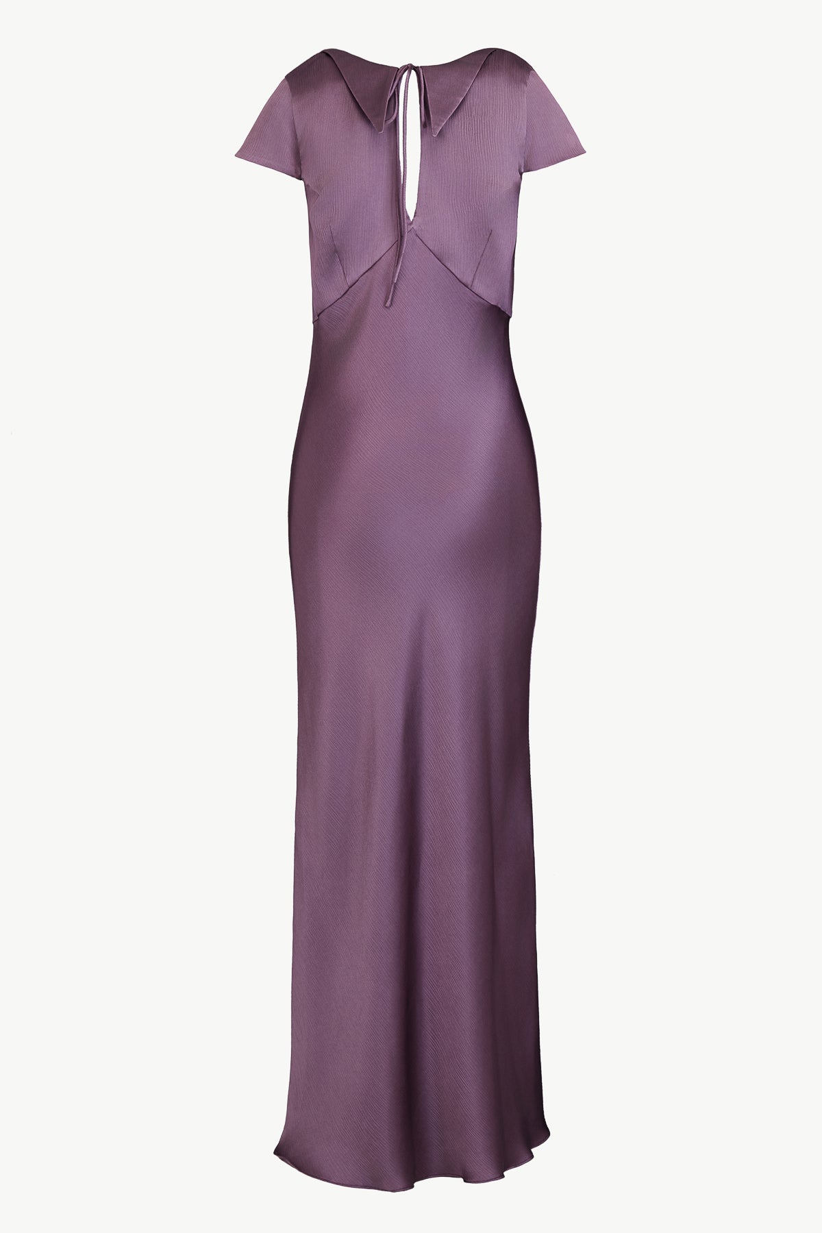 The Cosima Dress is crafted from silk crepe satin in a soft grape tone. It is cut on the bias, and features and collar, keyhole and tie detail on the neckline, a deep V on the back and short sleeves.