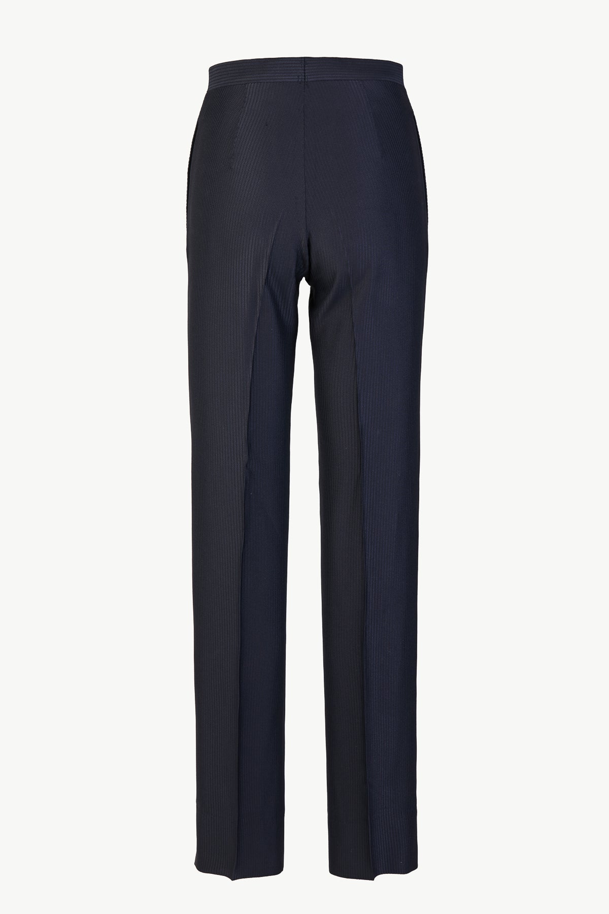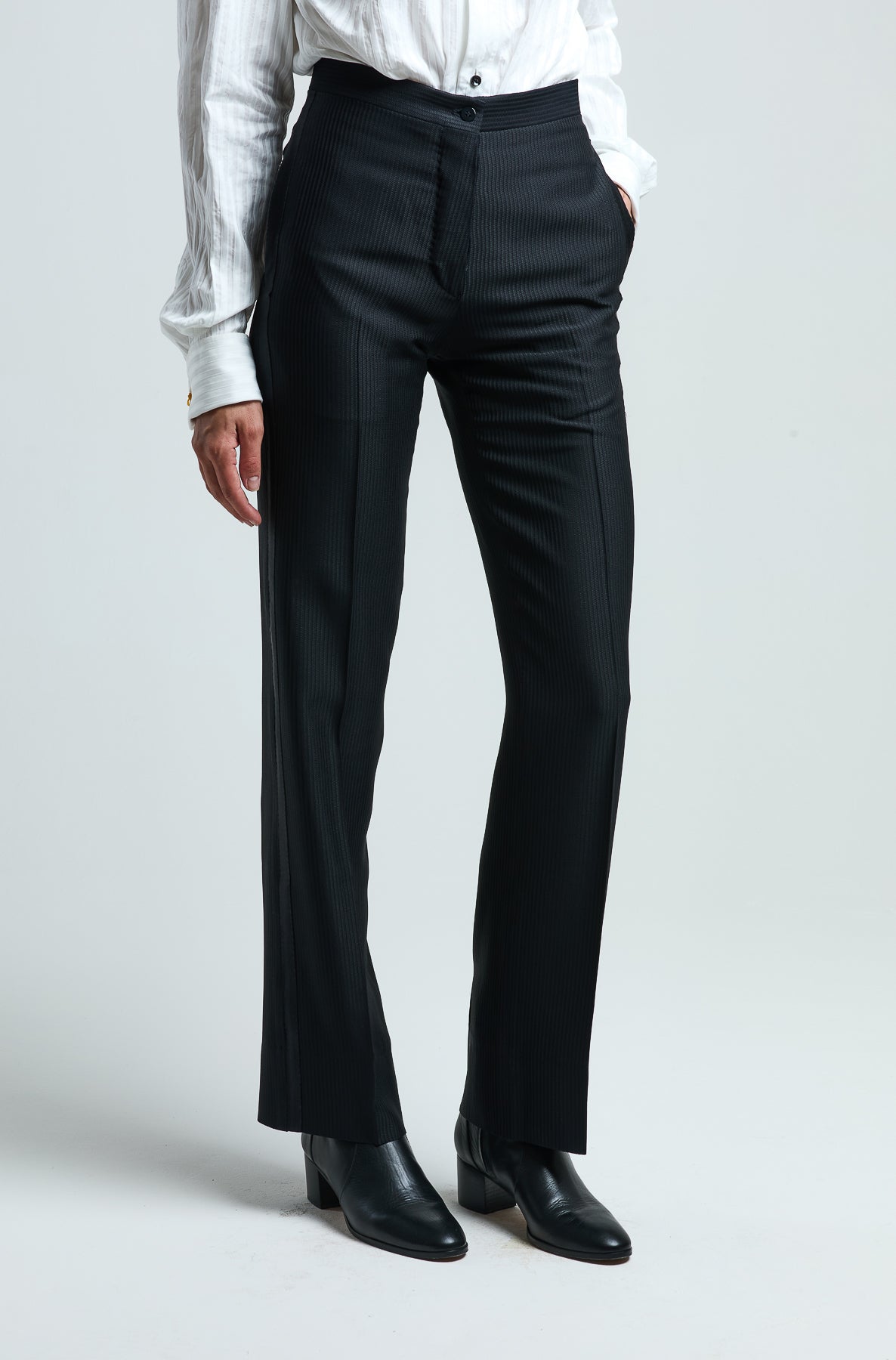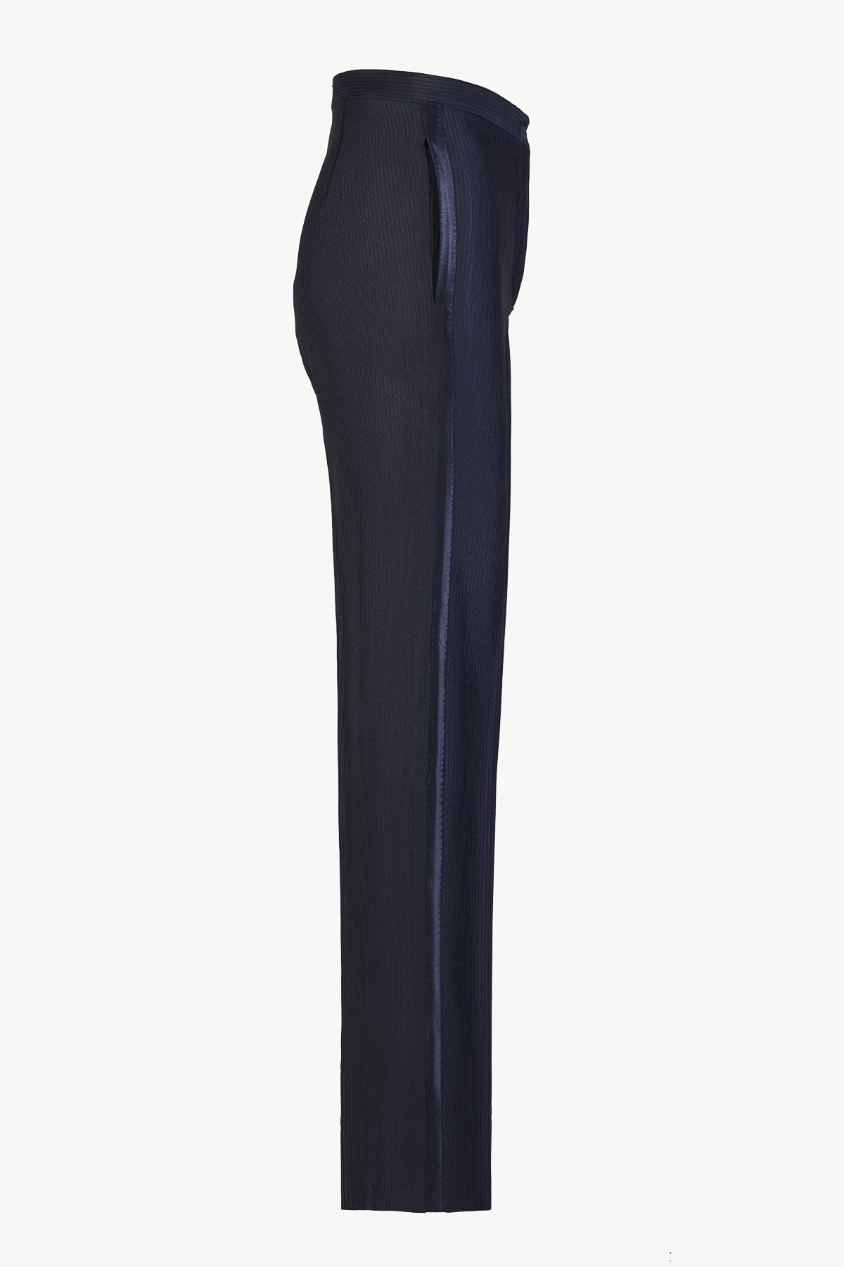 High-waisted trousers smoking trousers cut in a textured silk blend with subtle black stripes. Designed with a straight leg, a satin side band and finished with side pockets and a clean waistband.