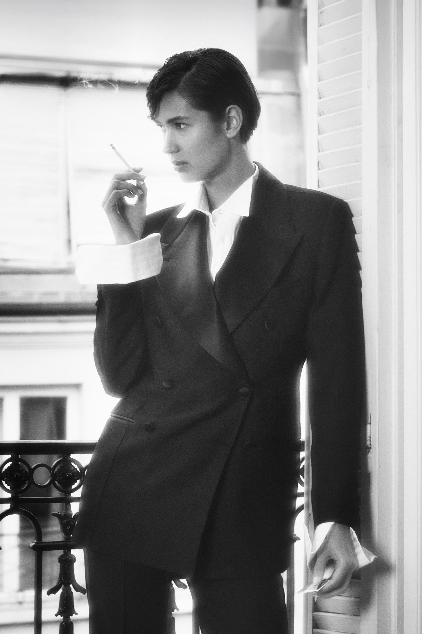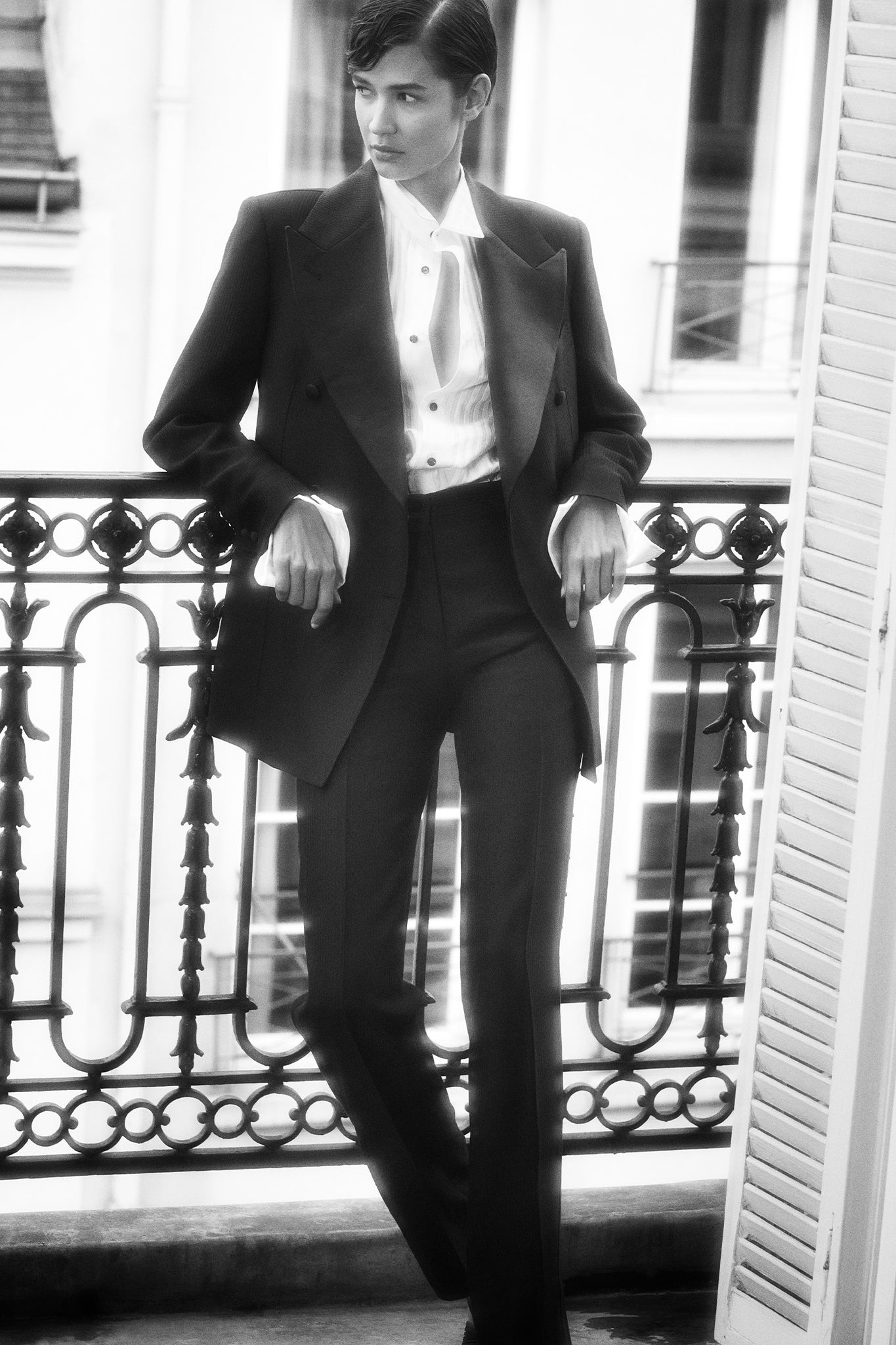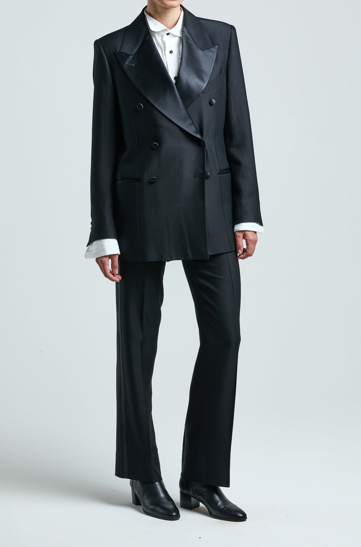 High-waisted trousers smoking trousers cut in a textured silk blend with subtle black stripes. Designed with a straight leg, a satin side band and finished with side pockets and a clean waistband.