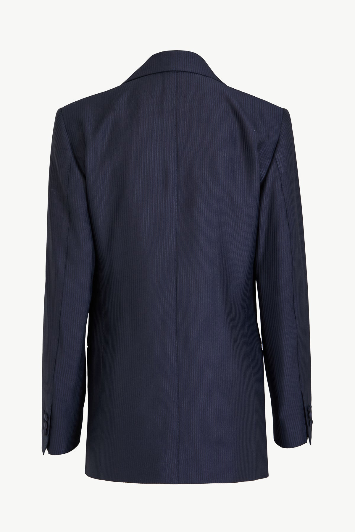Double-breasted blazer crafted in a textured silk blend with subtle black stripes. Finished with satin peak lapels, covered buttons, and full lining. Made in Italy with Giuliva’s signature attention to tailoring and detail.