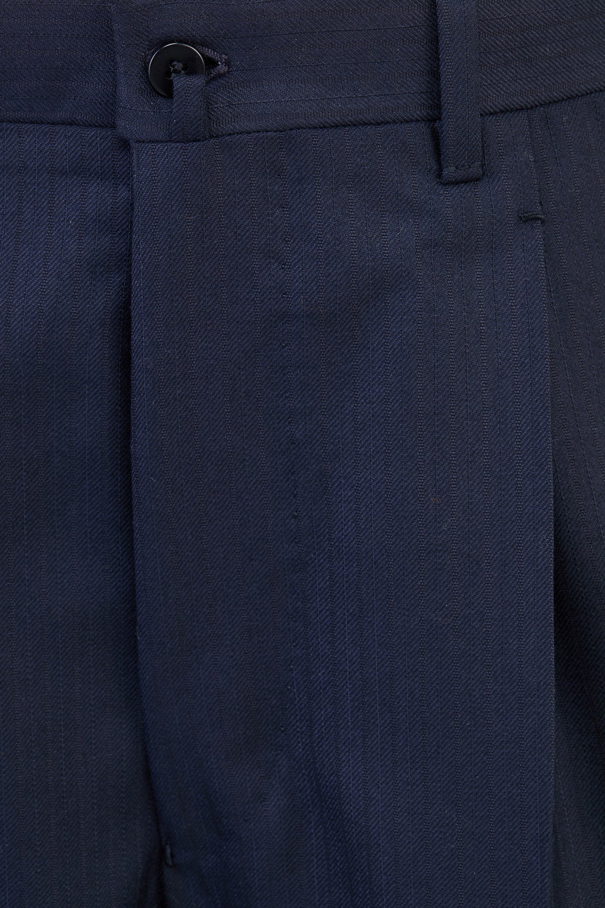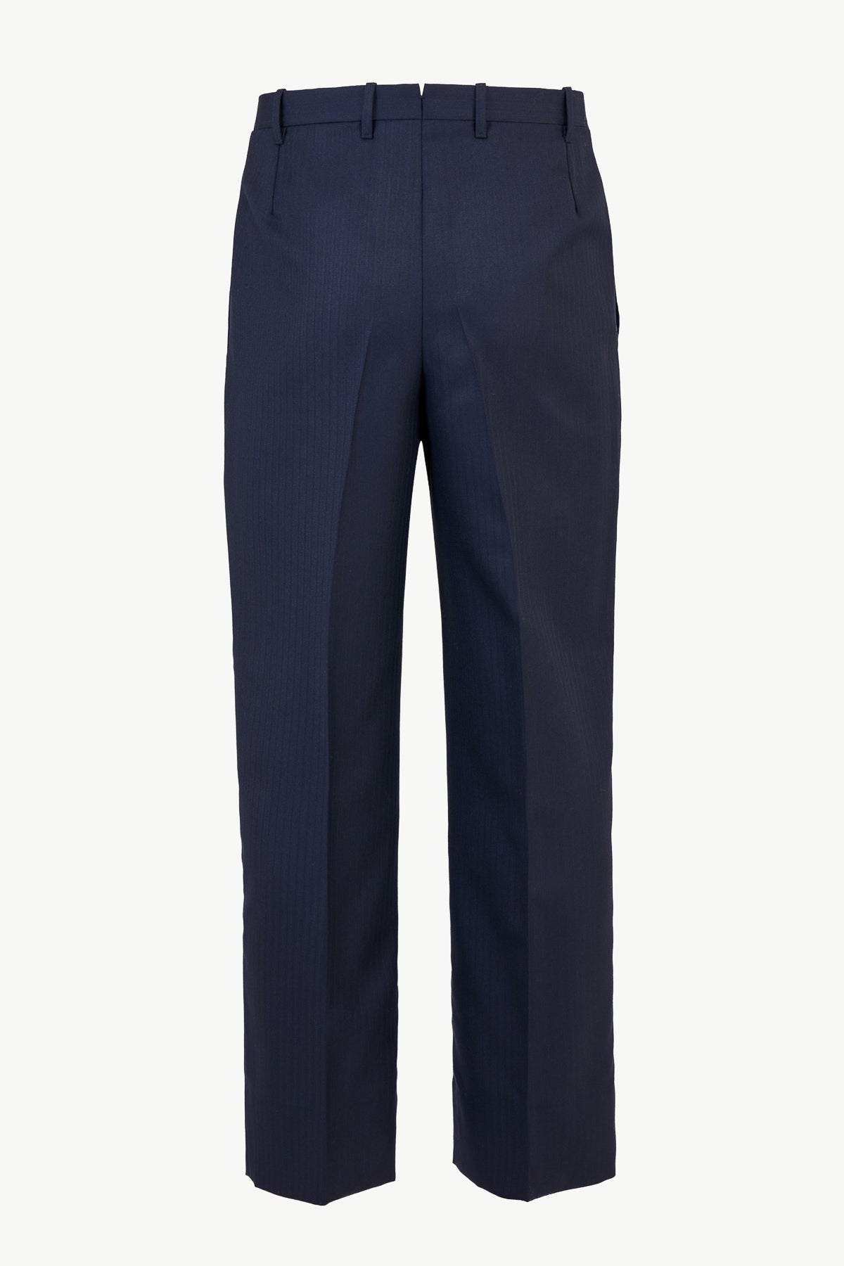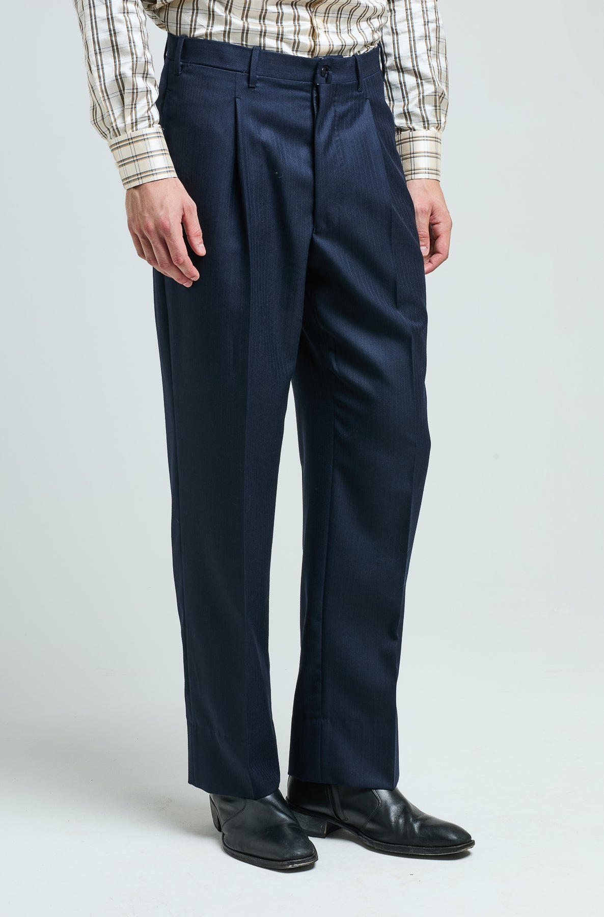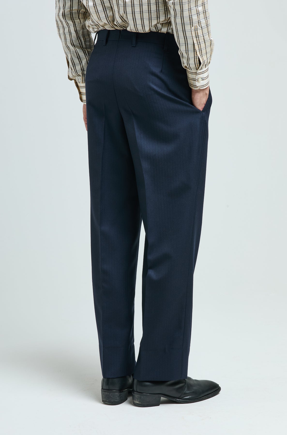 Our Vito trousers are hand-tailored straight-leg trousers crafted in a navy blue wool herringbone. They feature one front pleat, side seam pockets, and a concealed button closure. A small loop at the waistband holds the belt buckle in place, while a discreet pocket hidden under the waistband is designed to hold coins or a watch. At the back, a small opening in the waistband adds ease and comfort. True to traditional tailoring, they come un-hemmed for a personalized fit.