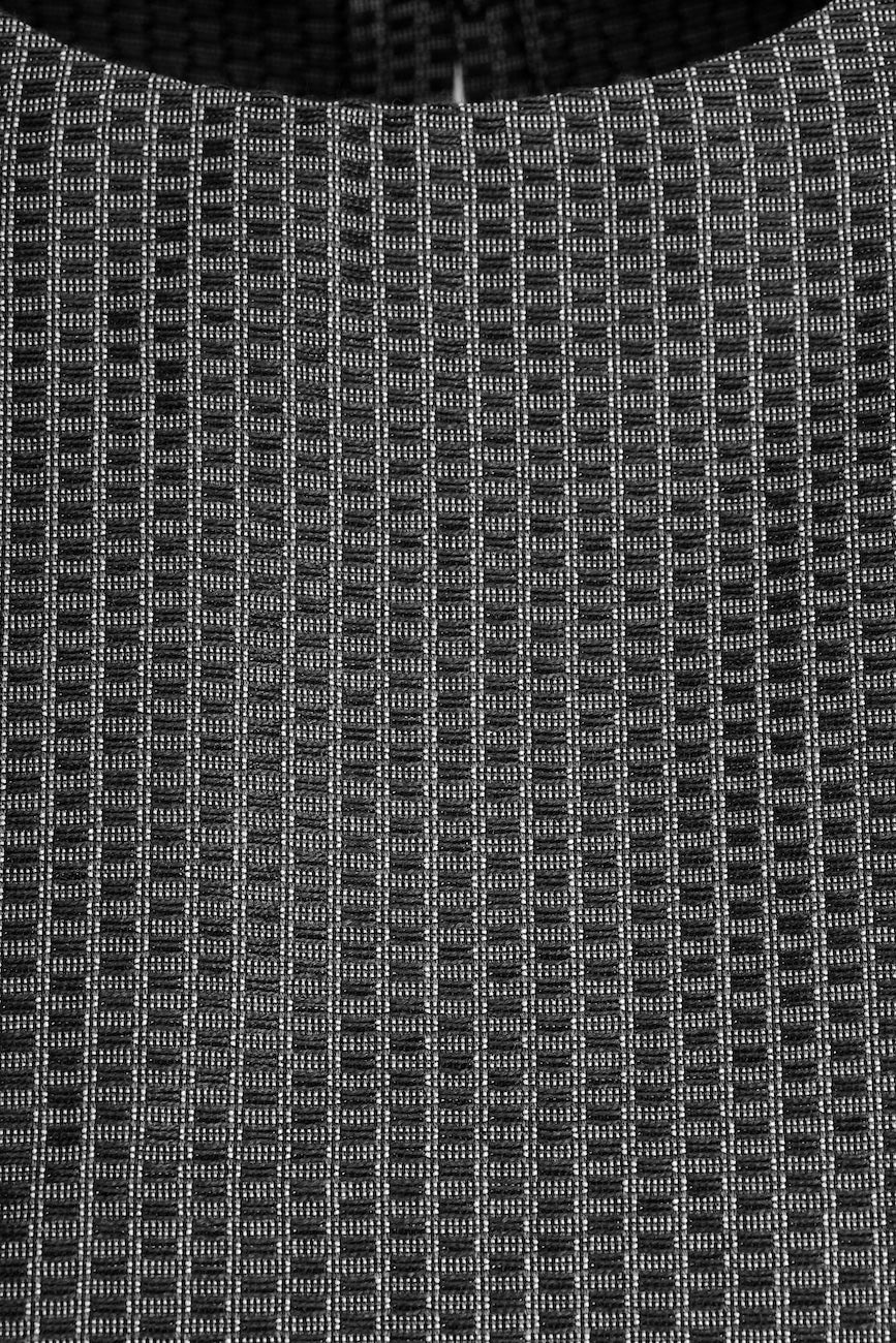 A minimalist silhouette defined by clean lines and sculptural simplicity. The Ava Top is crafted in a luxurious wool and silk blend, featuring a geometric woven pattern that adds depth and texture to the fabric. Designed with short, slightly structured sleeves and a straight cut, it closes with a button at the back for a seamless finish.