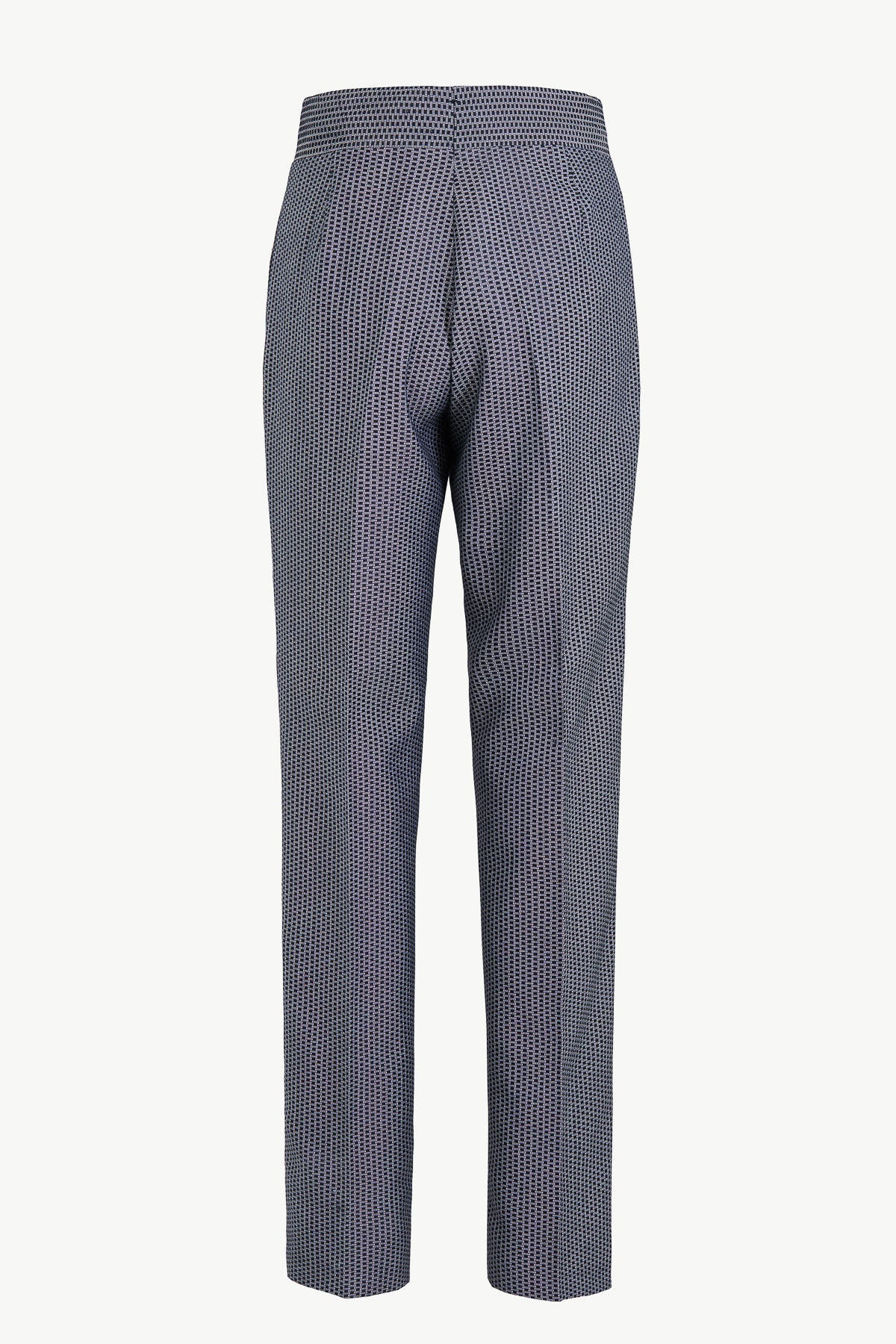 Tailored high-waisted trousers with a straight leg and a single front pleat. Designed with in-seam side pockets and a small front watch pocket, they are made from a wool and silk blend featuring a blue geometric pattern.