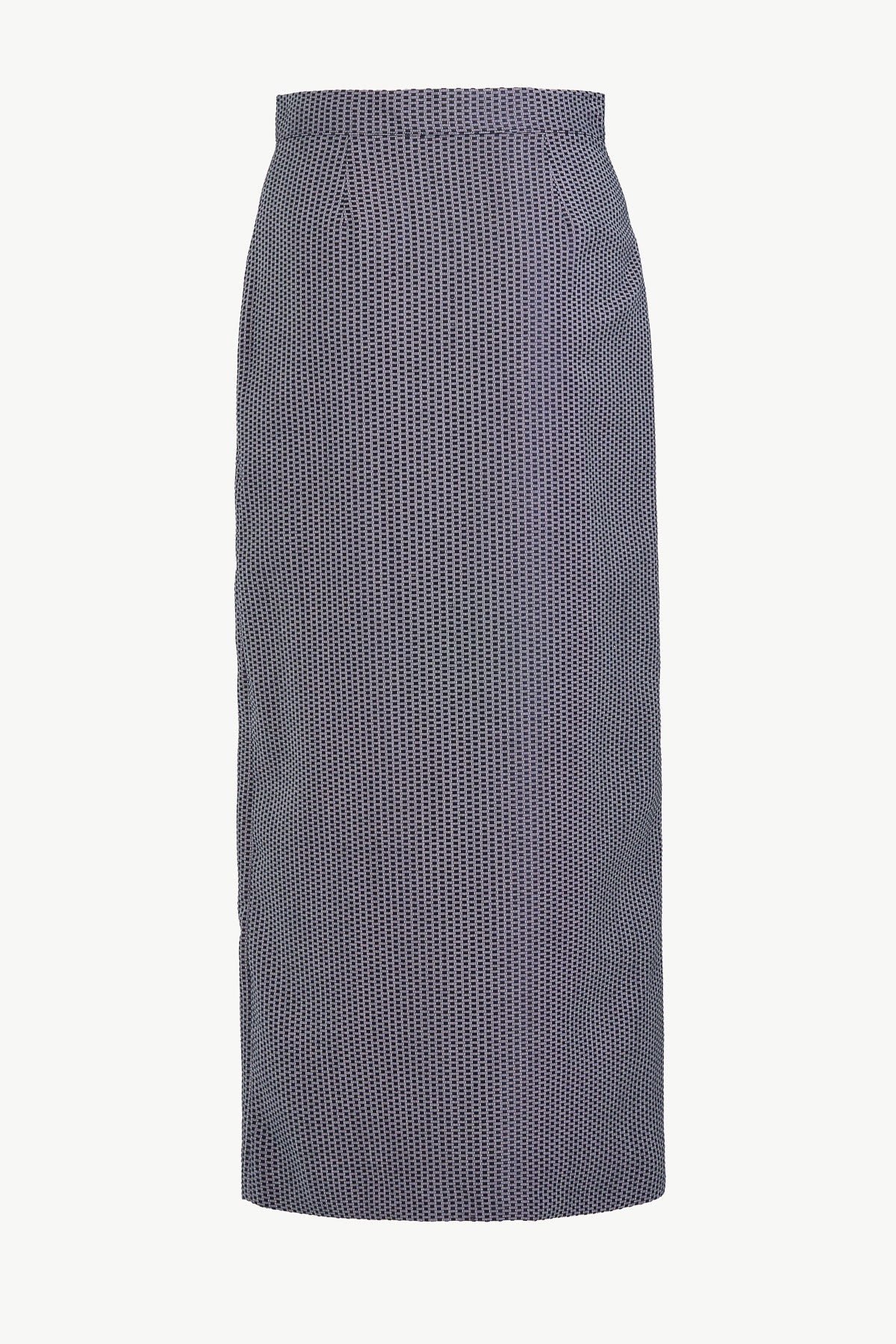 A sleek, high-waisted pencil skirt with a straight silhouette and a front slit for ease of movement. The Sadie Skirt fastens asymmetrically with a row of buttons and is crafted from a wool and silk blend in a subtle geometric pattern.