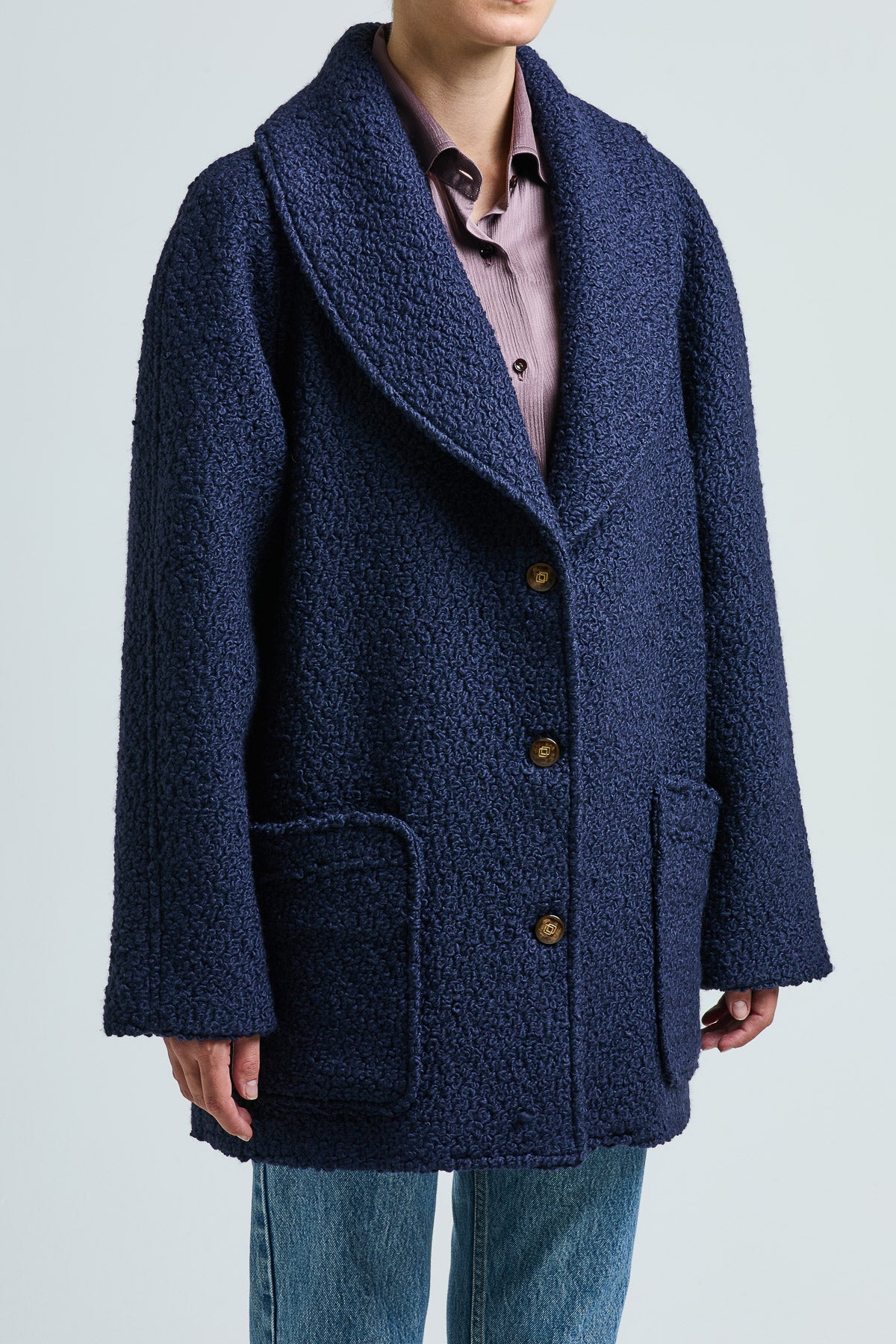 The Rosella Coat is crafted from chunky wool bouclé and designed with a relaxed silhouette. Fully lined, it features a soft shawl collar, three-button fastening, and large patch pockets on the front.