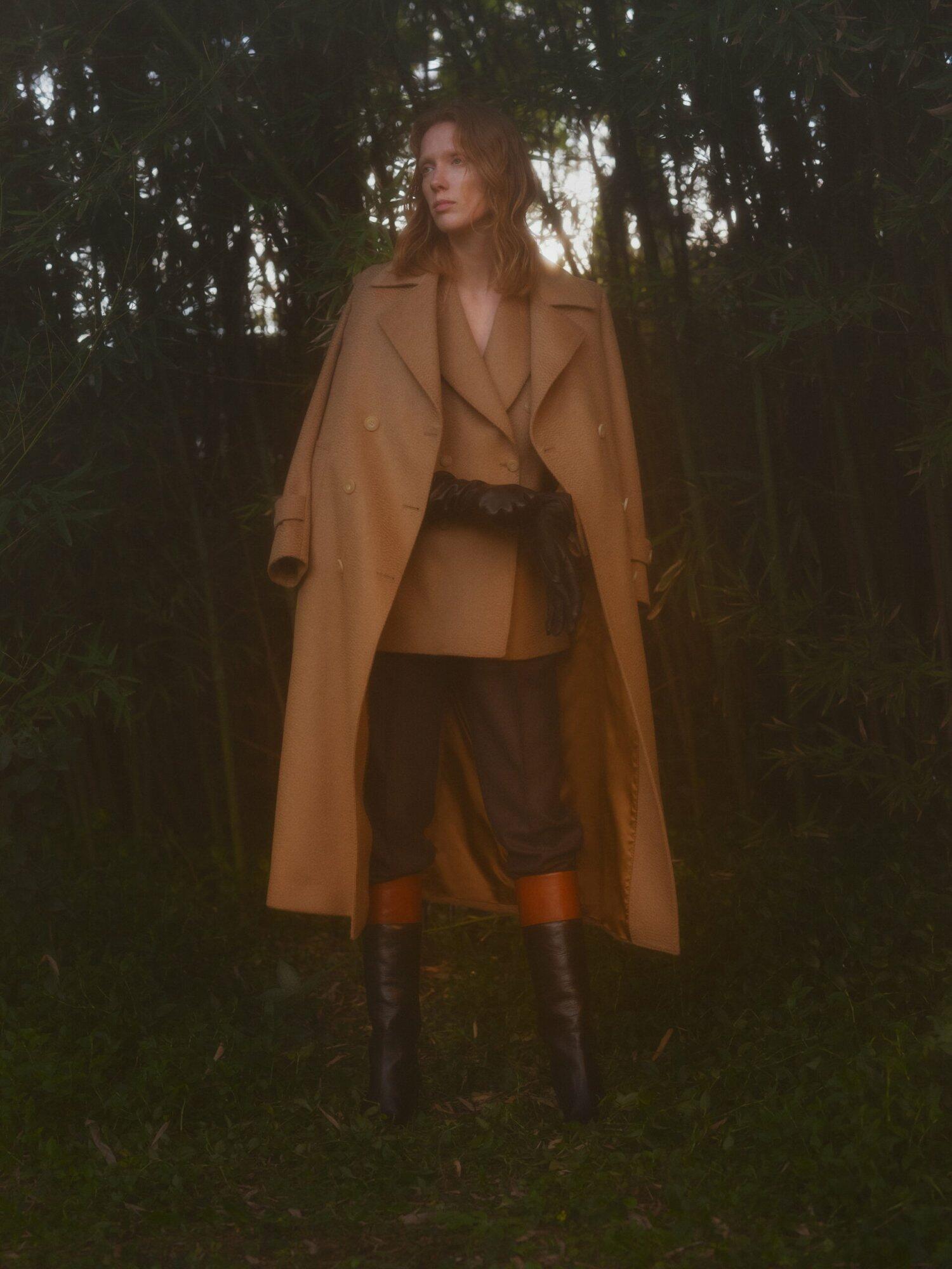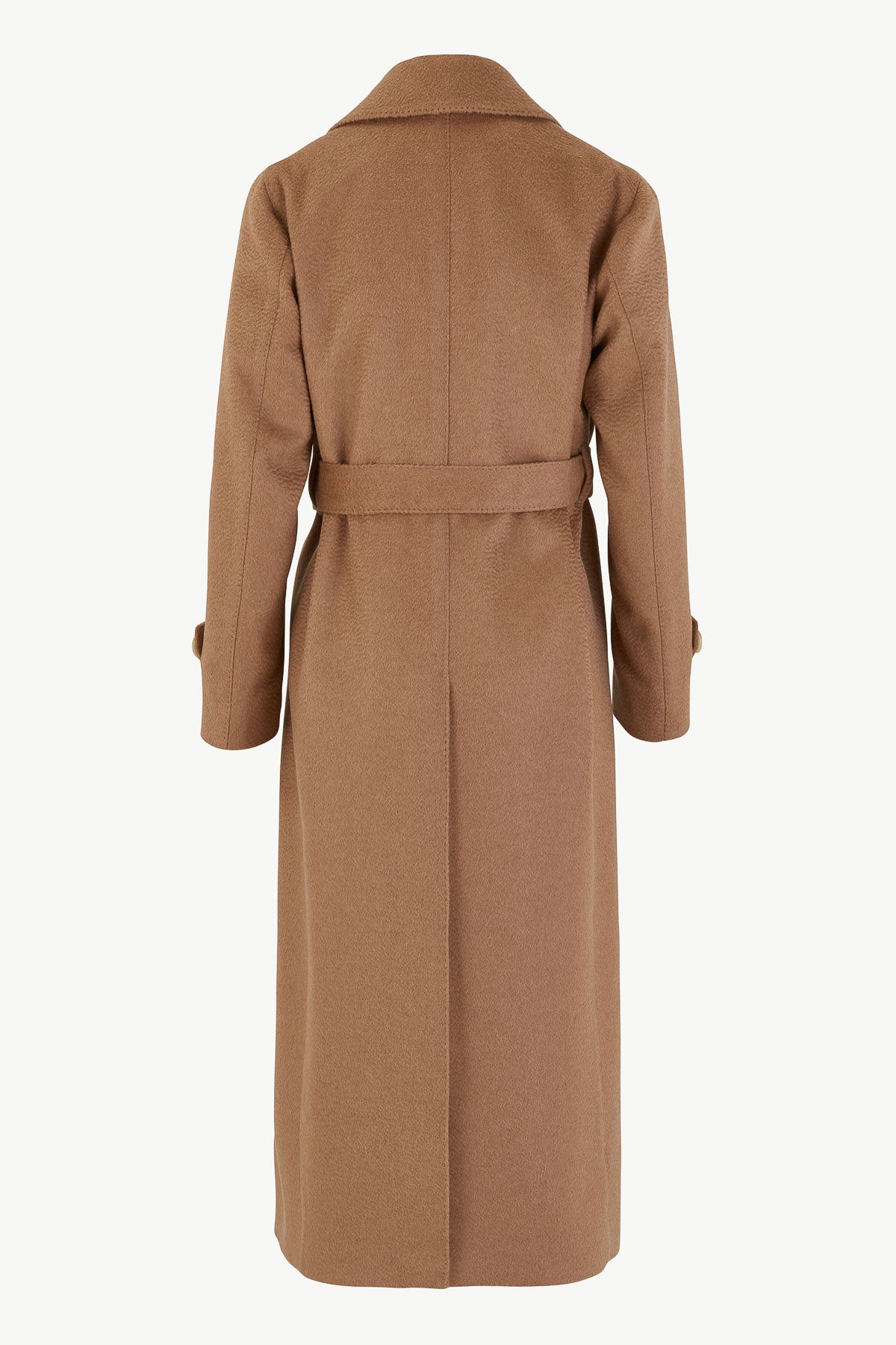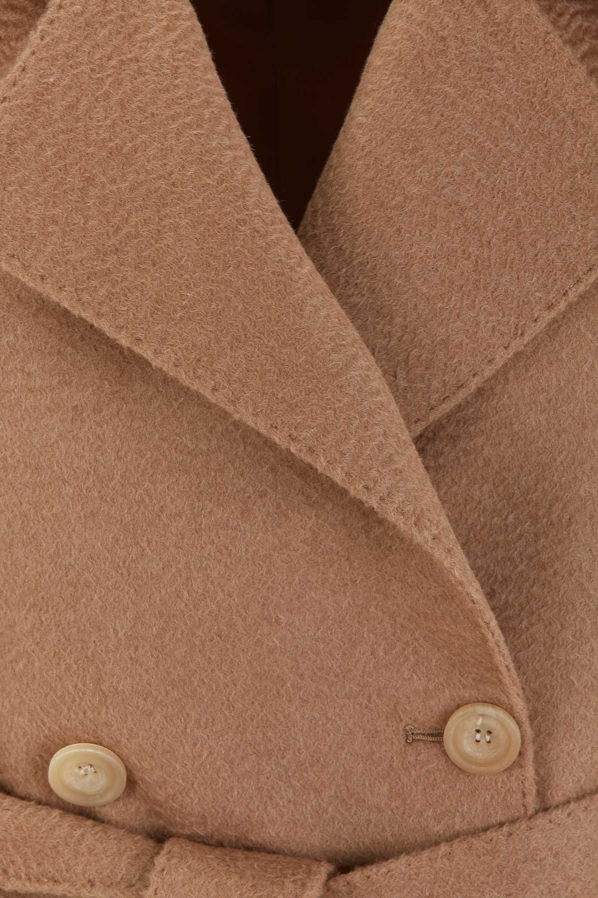 Tailored double breasted trench coat in camelhair with six buttons and fabric belt