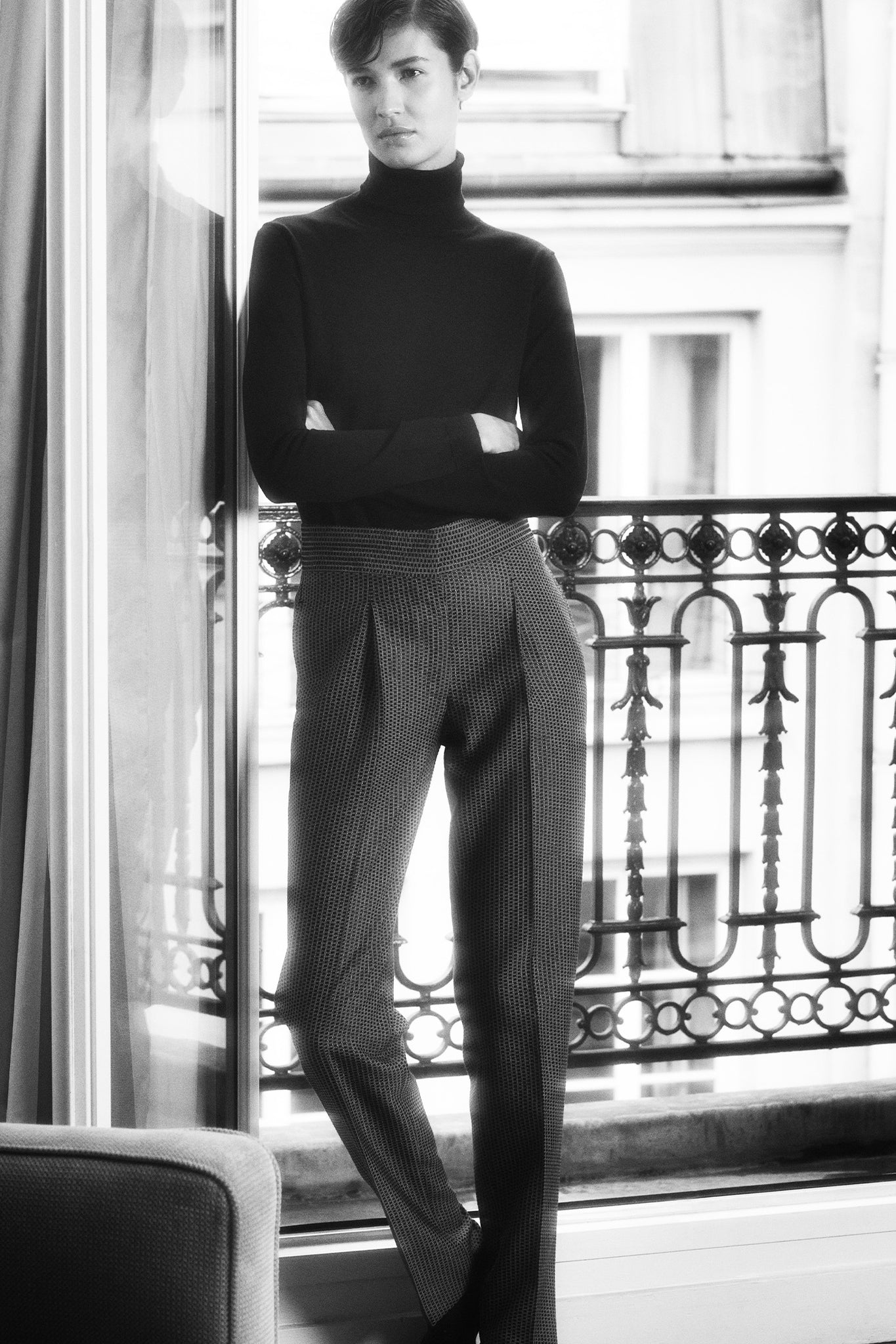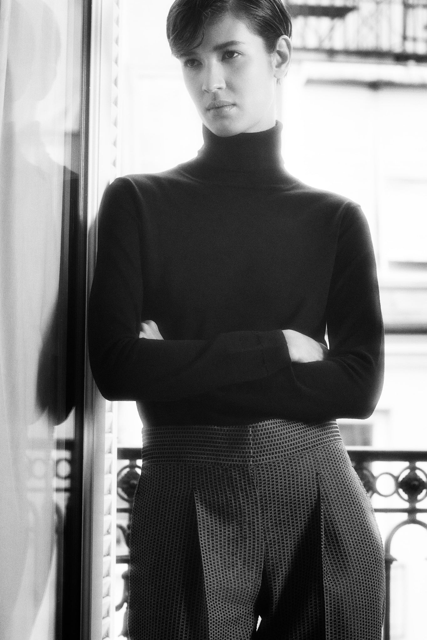 Long sleeved, turtleneck sweater in soft virgin wool knit.