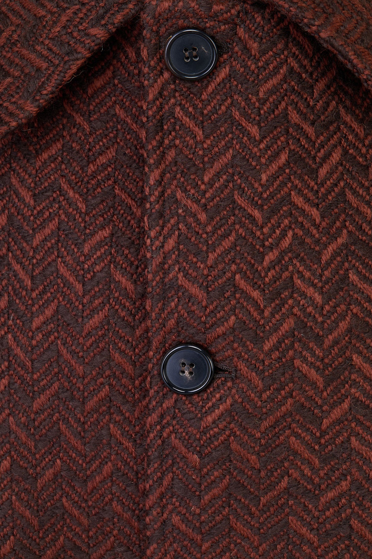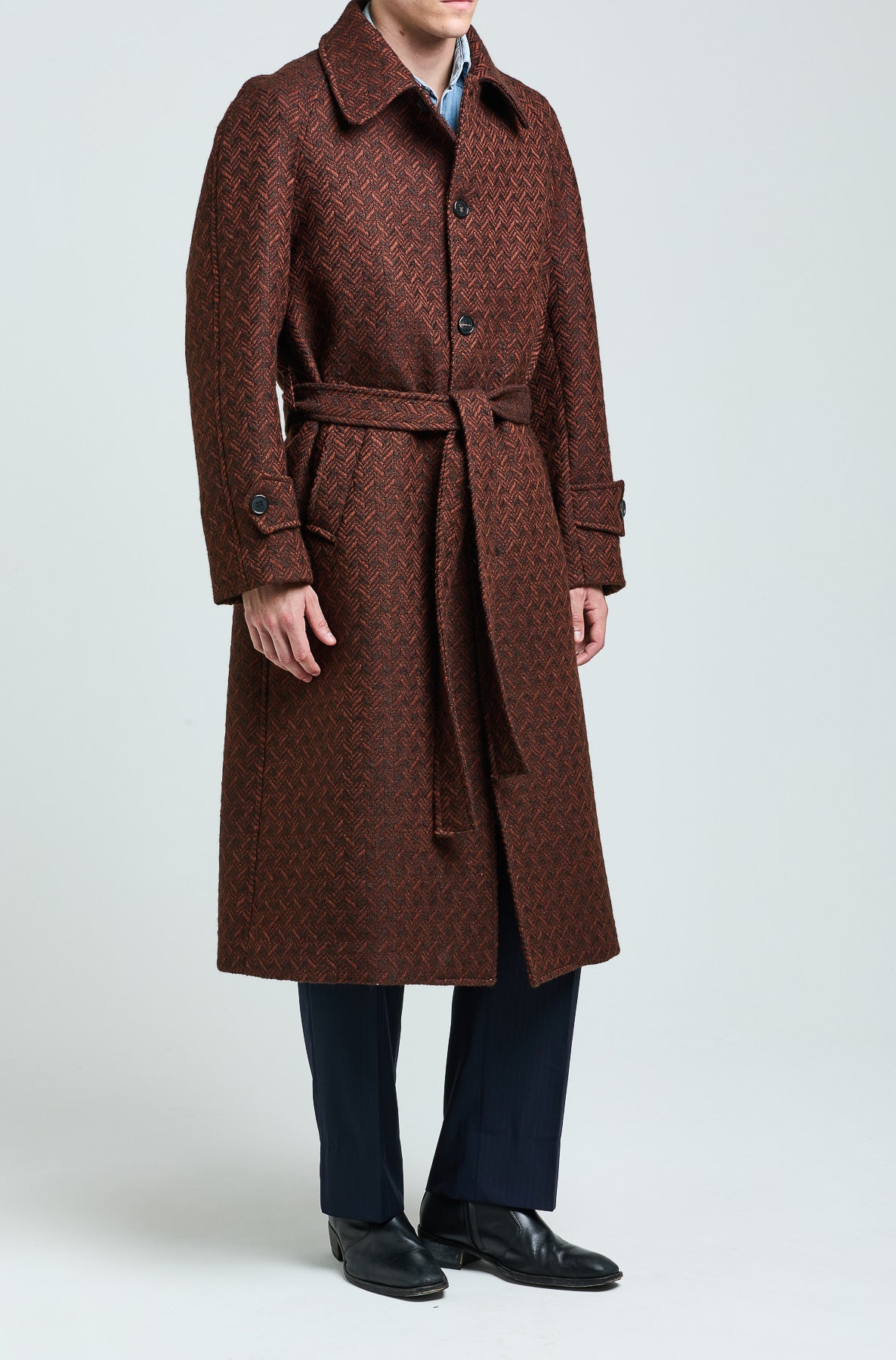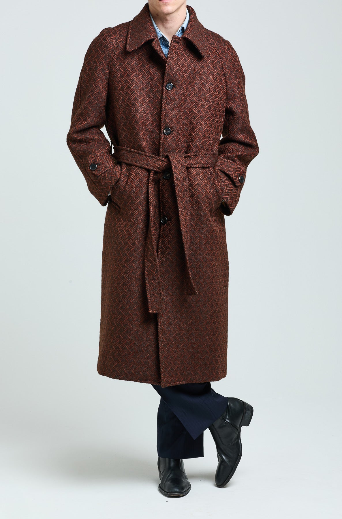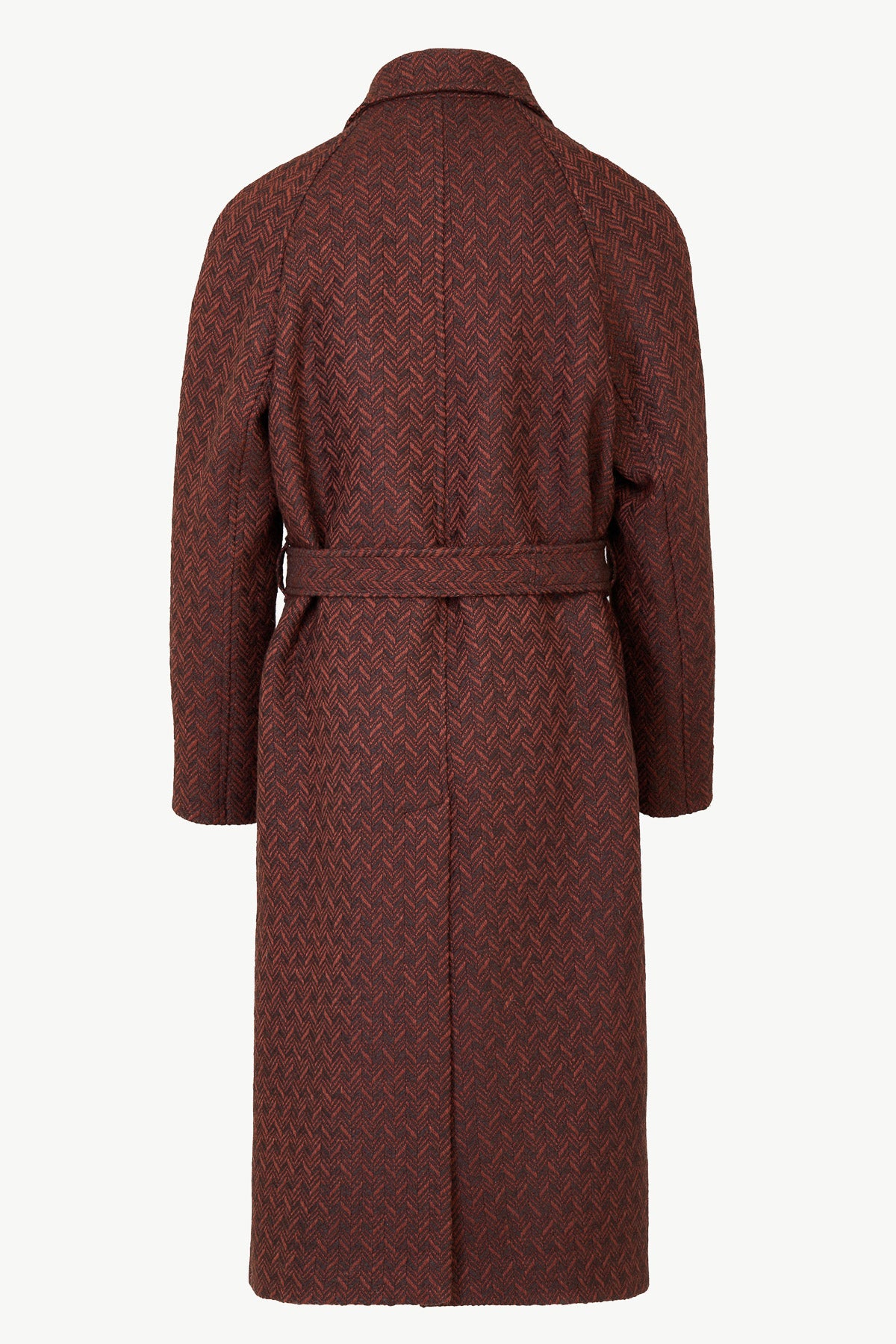 The Arturo Coat is cut from a rich, textured wool in a deep red herringbone weave. This long overcoat features a classic collar, button front, and a self-tie belt to define the silhouette. Finished with buttoned cuffs and raglan sleeves for ease of movement, it’s a warm, weighty layer with presence, made for cold days and bold entrances.