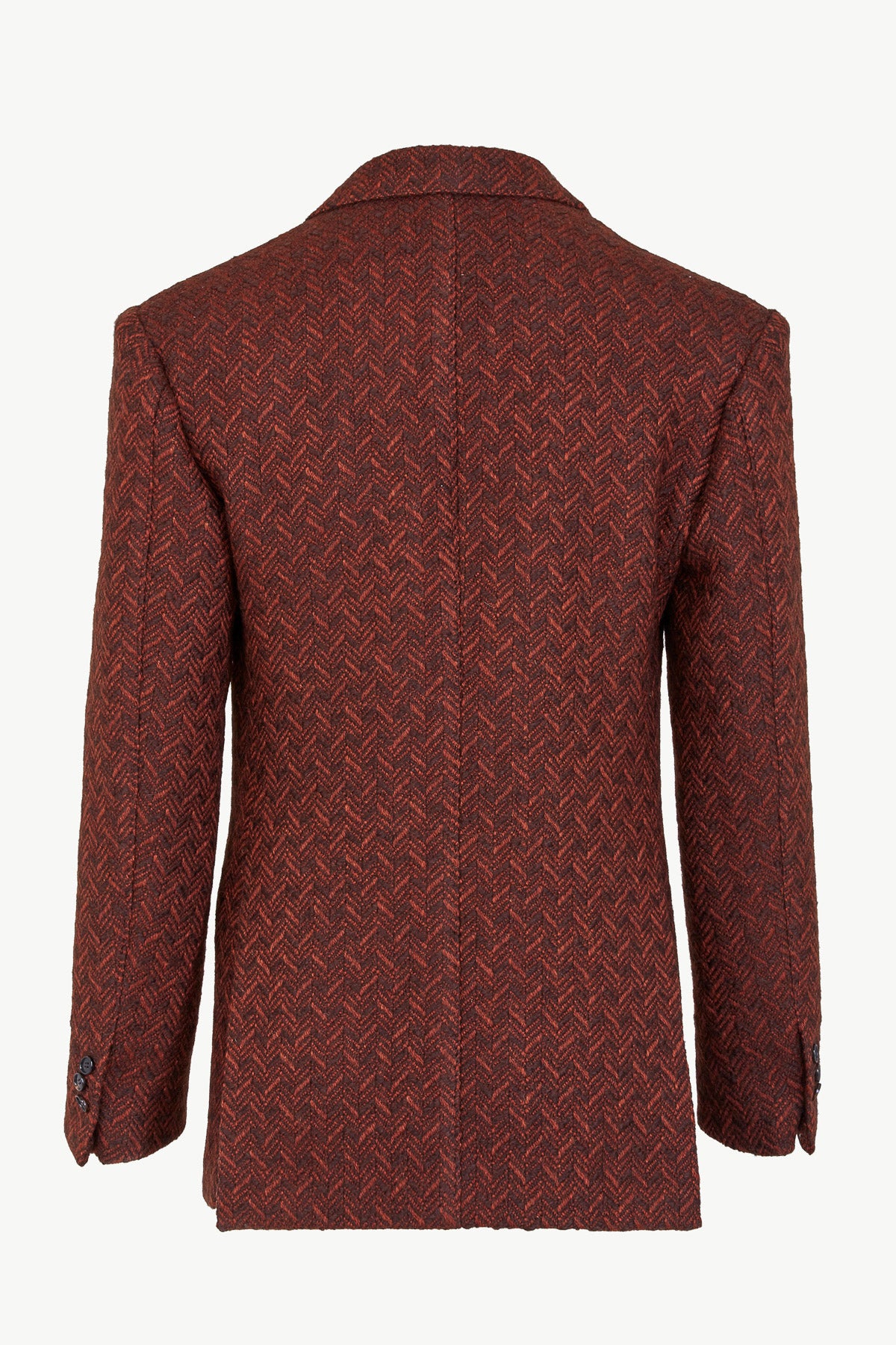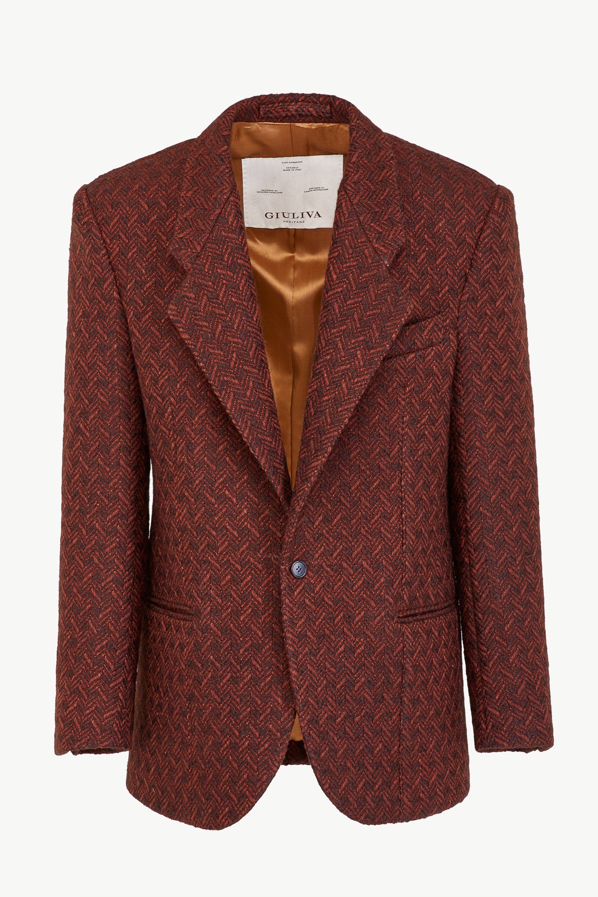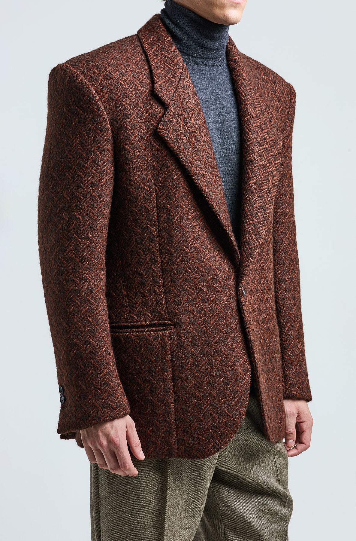 A bold single-breasted blazer with constructed shoulders and pointed notch lapels. The Aston is cut from wool in a textured herringbone weave, blending warm tones of rust and pecan brown.