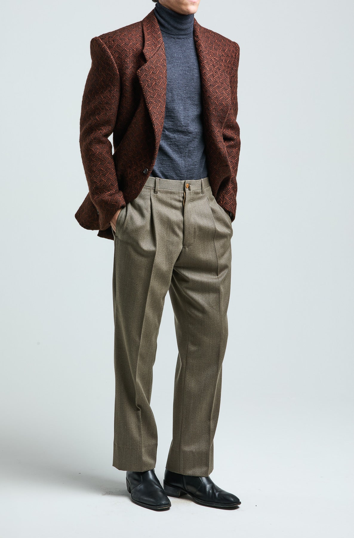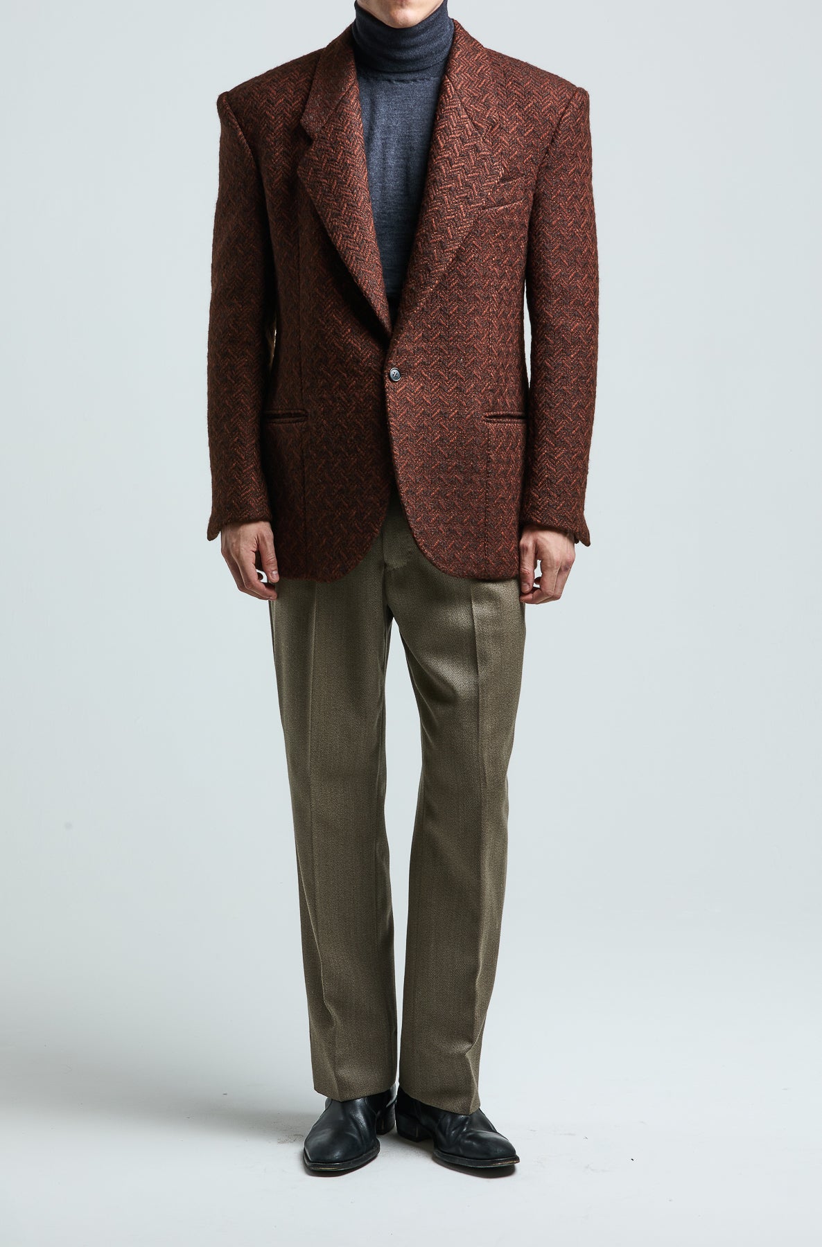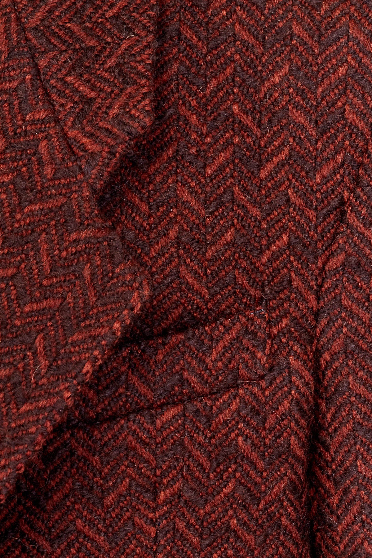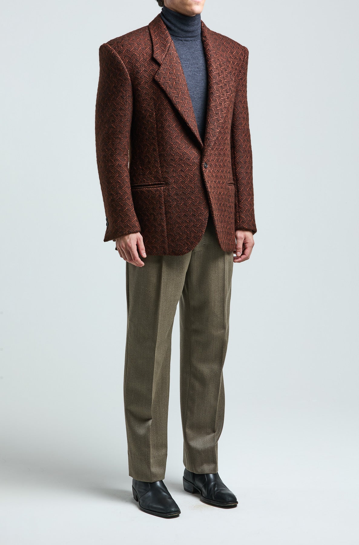 A bold single-breasted blazer with constructed shoulders and pointed notch lapels. The Aston is cut from wool in a textured herringbone weave, blending warm tones of rust and pecan brown.