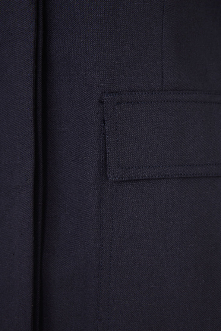 Tailored, single breasted, belted dust coat in luminous windowpane wool with raglan sleeves, round shirt collar, and leather buckles on belt and on the sleeve cuffs.