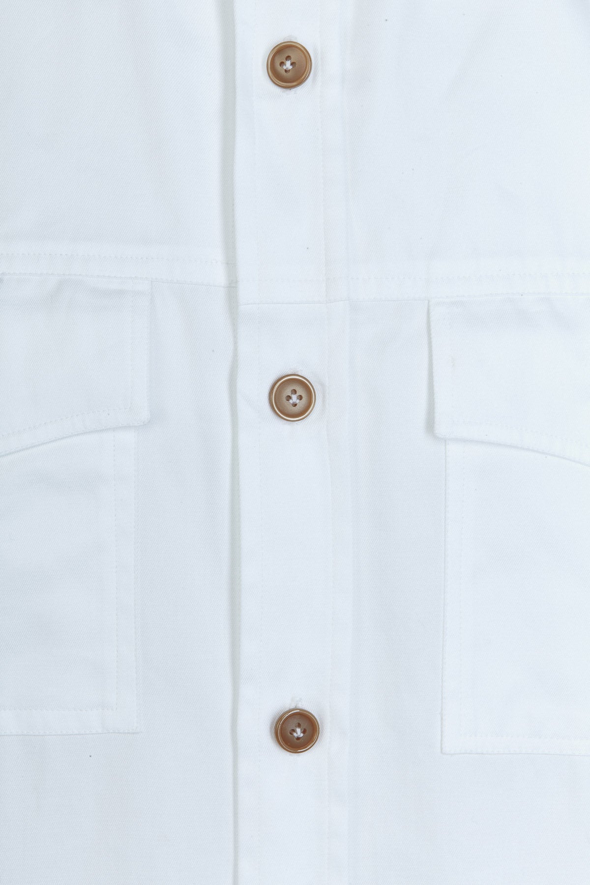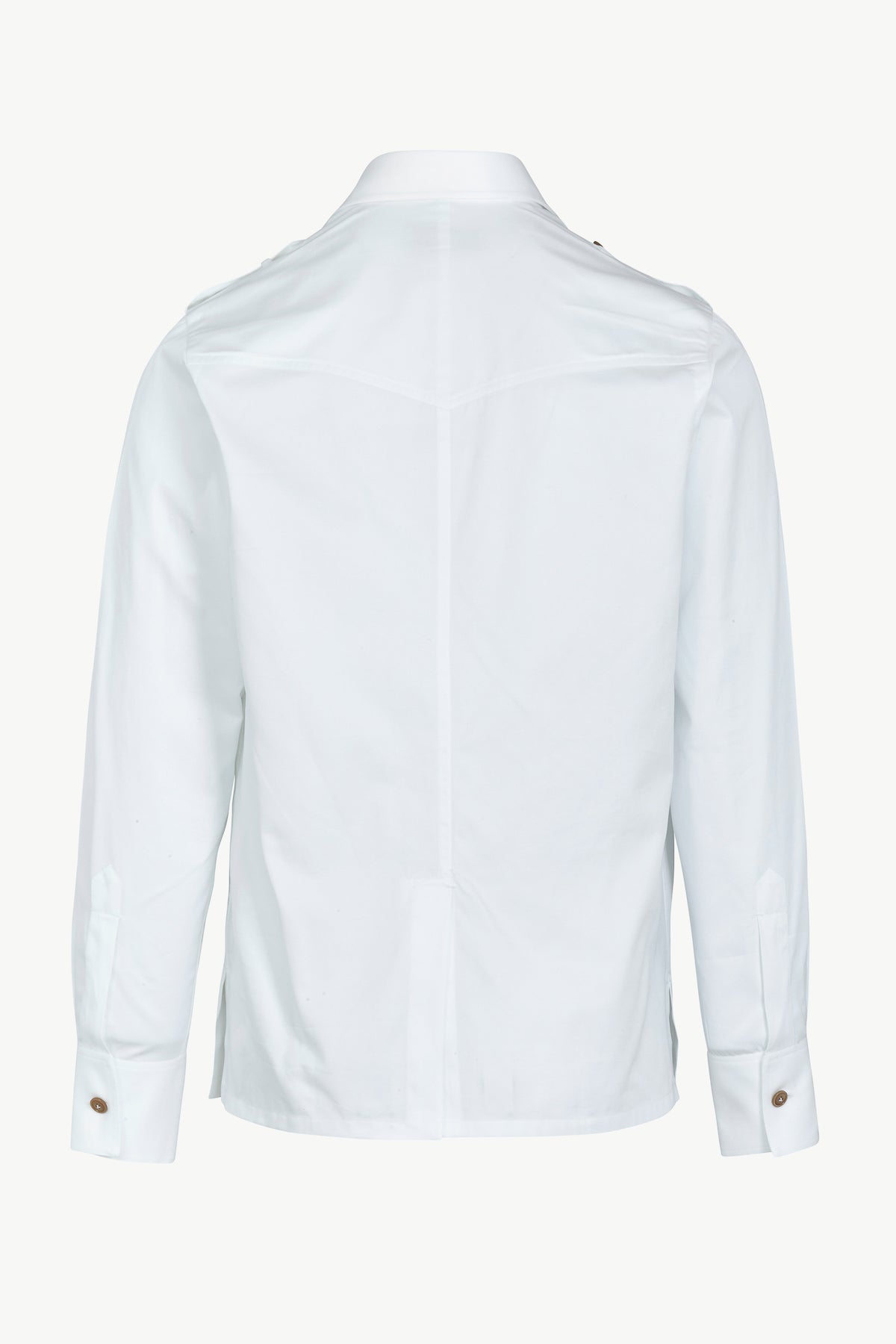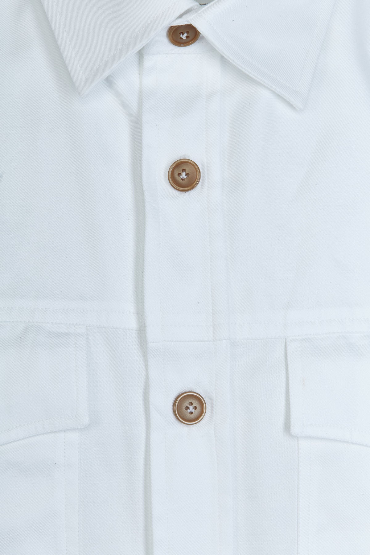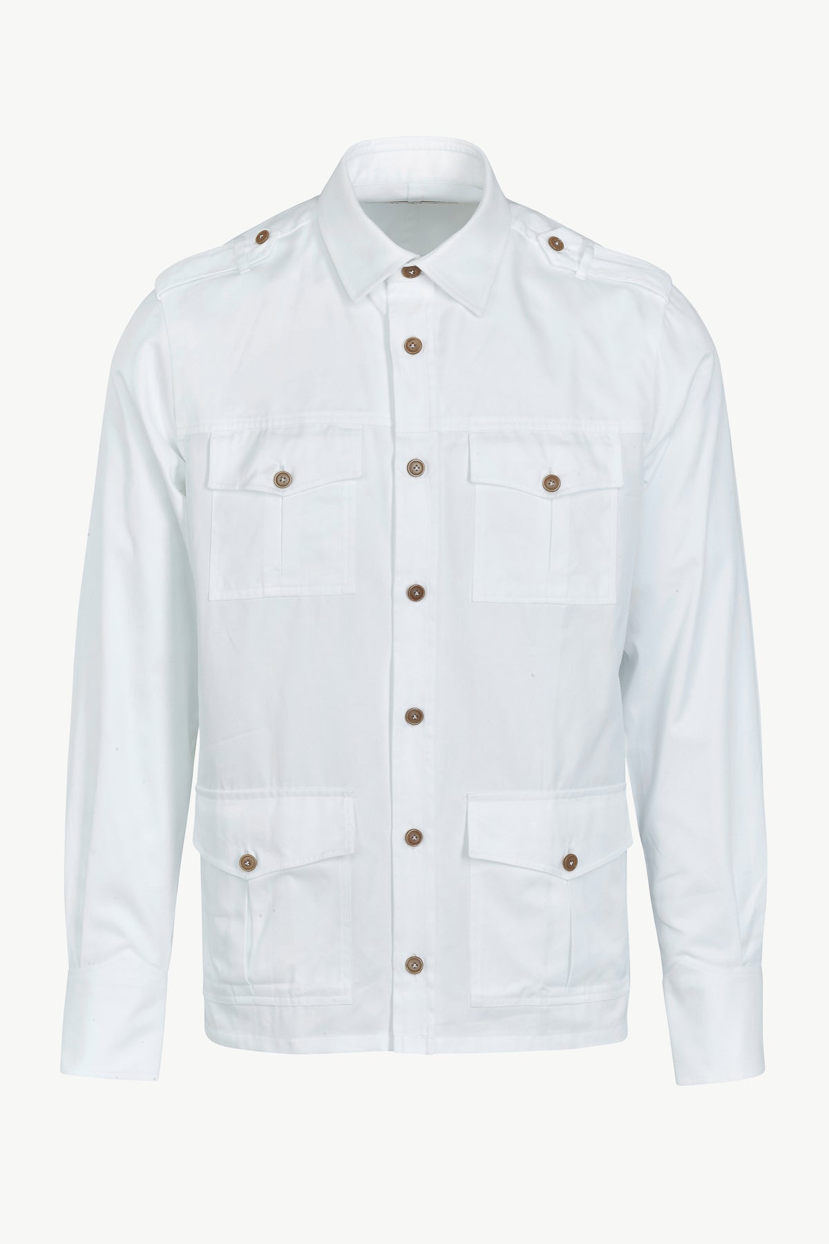 Our Cesare shirt is a white cotton safari-style shirt crafted in Italy. It features a cutaway collar, four front patch pockets with inverted pleats and flaps, and epaulettes on the shoulders. The sleeve cuffs have a pointed shape with a single button. There are three vents, two on the sides and two at the back, which improve fit and ease of movement.