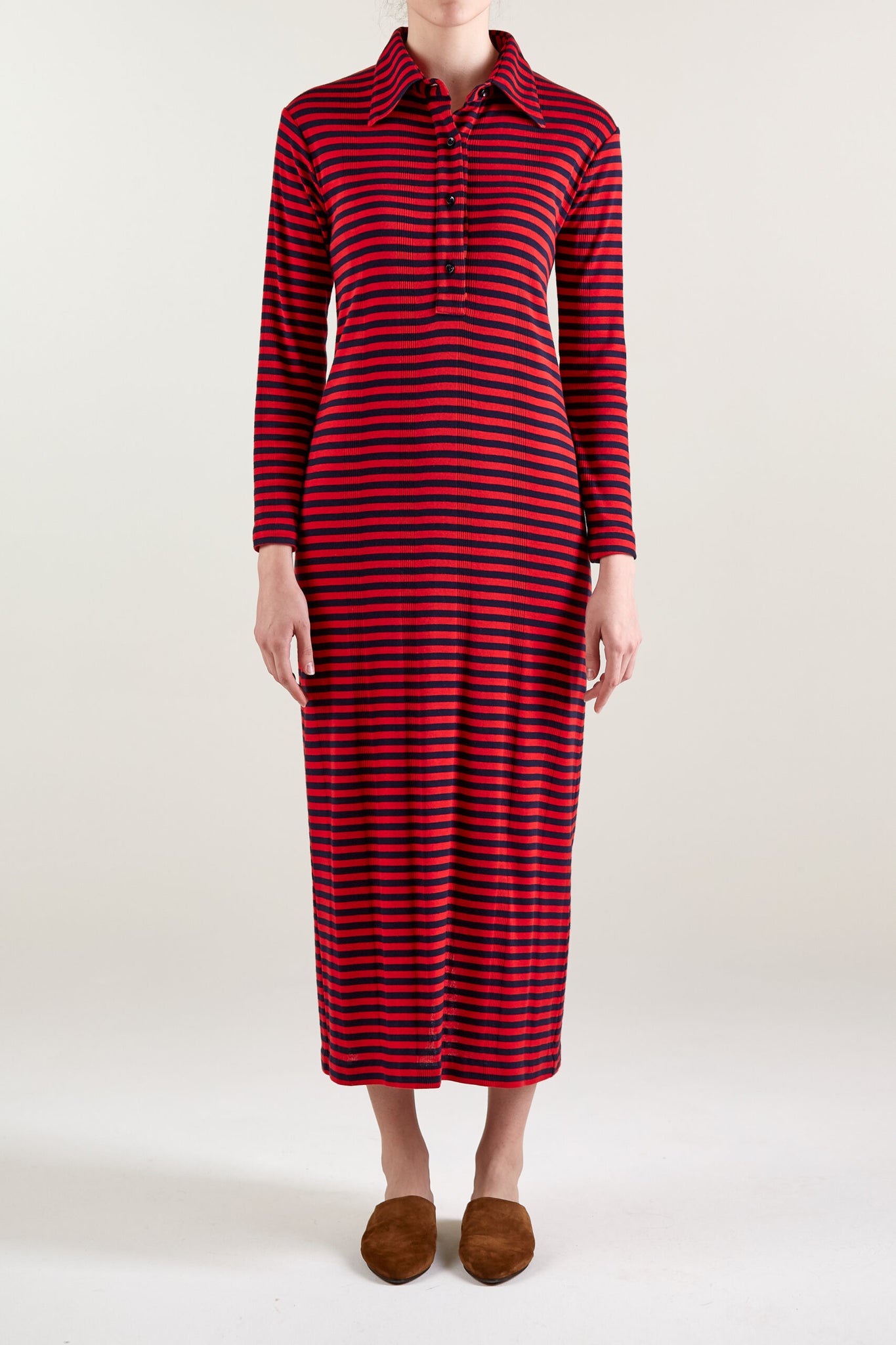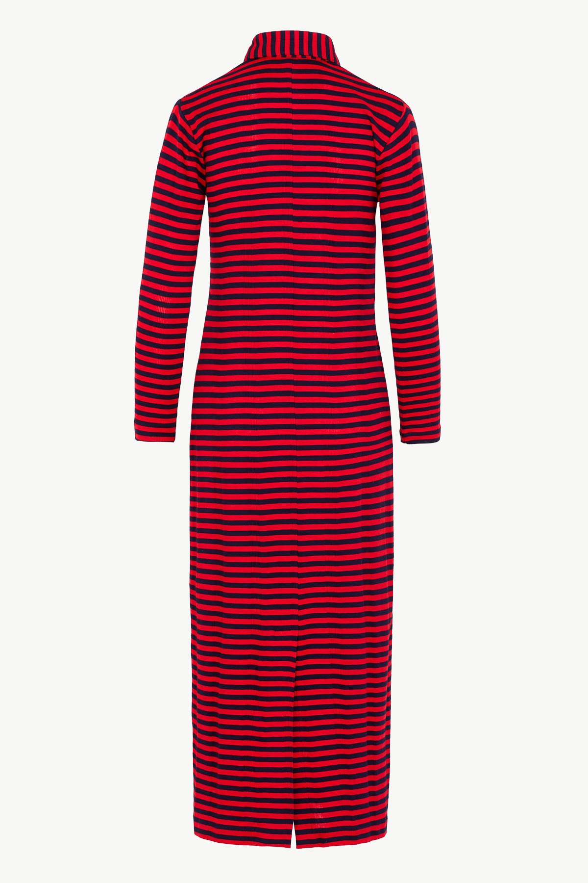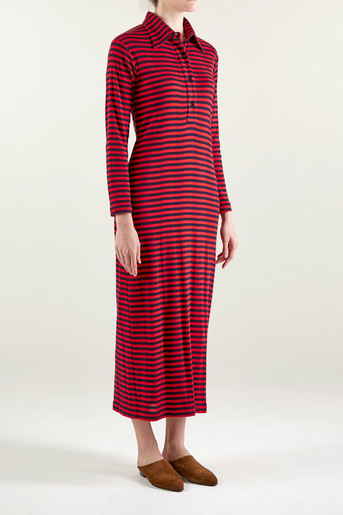 Our Ingrid dress is a long-sleeved, ankle-length shirt dress cut in striped cotton jersey. It features a pointed collar, a half-button placket, and a straight silhouette that follows the line of the body. The fabric has a soft, dry hand and natural stretch, making it a comfortable layer with a clean, graphic look.