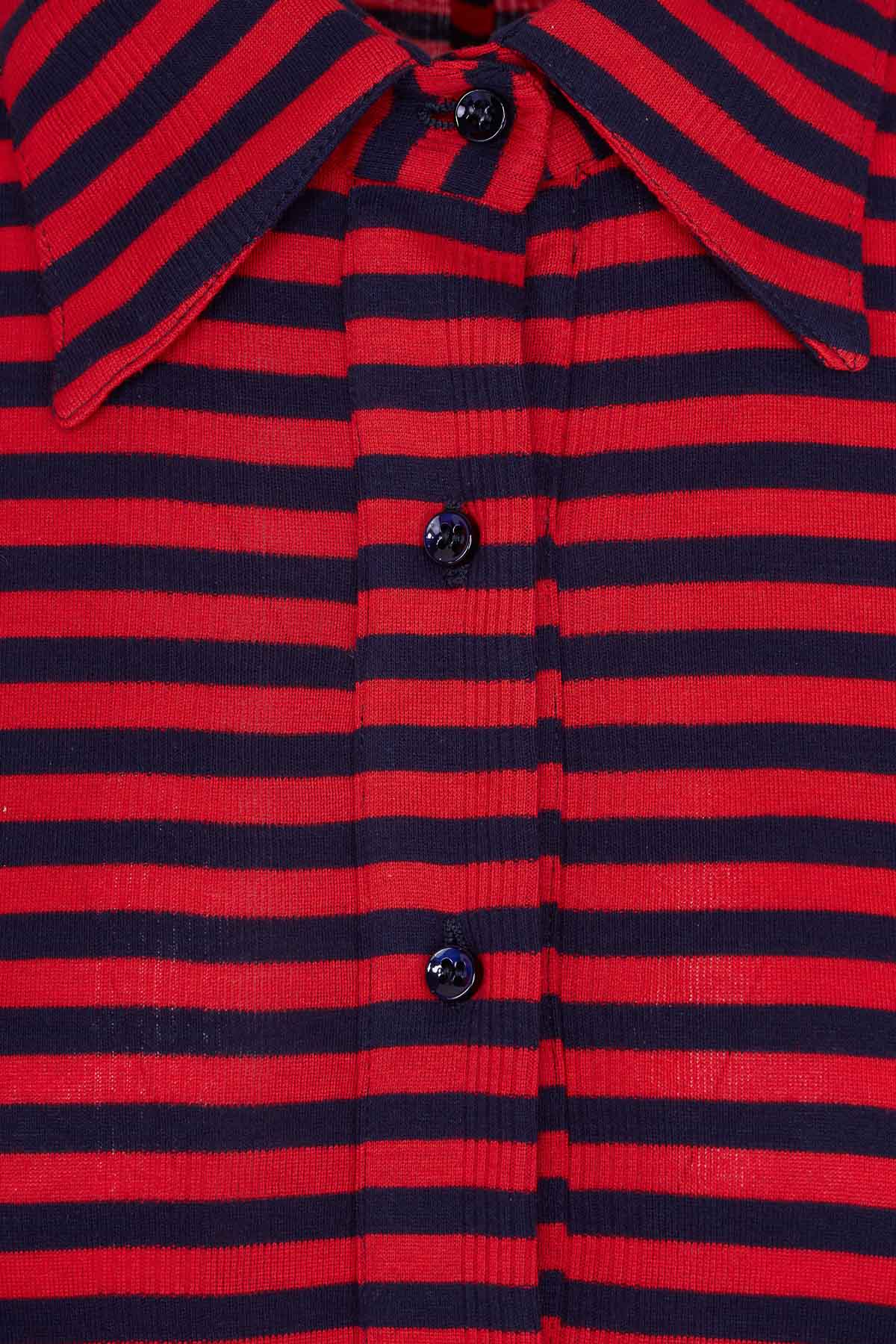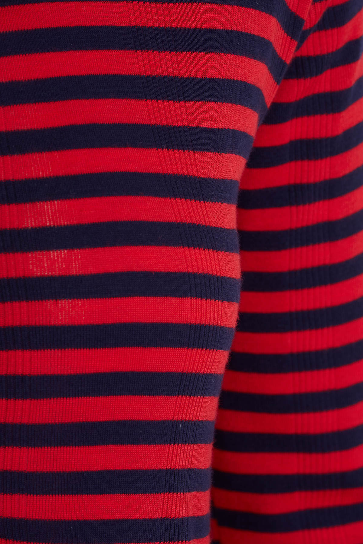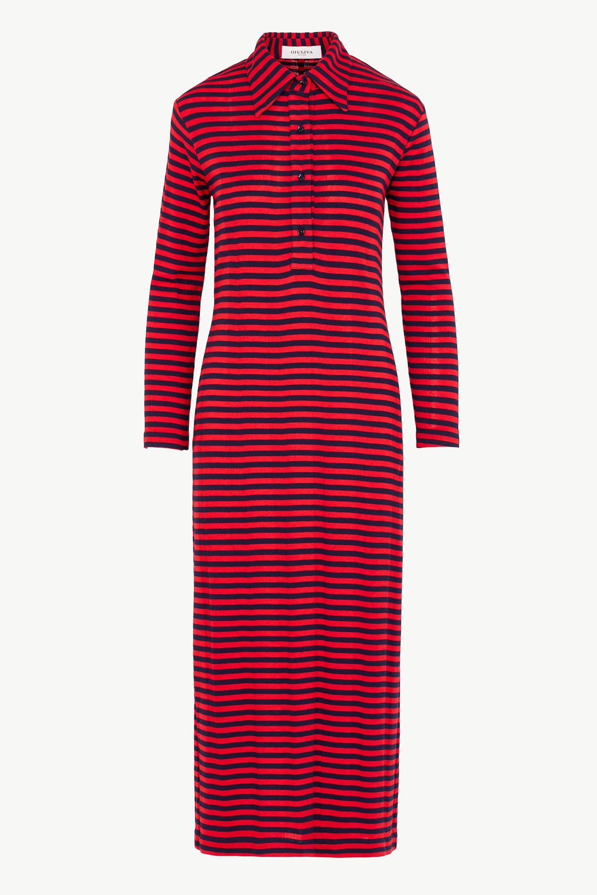 Our Ingrid dress is a long-sleeved, ankle-length shirt dress cut in striped cotton jersey. It features a pointed collar, a half-button placket, and a straight silhouette that follows the line of the body. The fabric has a soft, dry hand and natural stretch, making it a comfortable layer with a clean, graphic look.