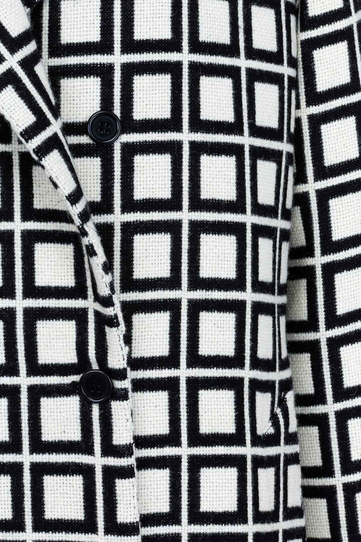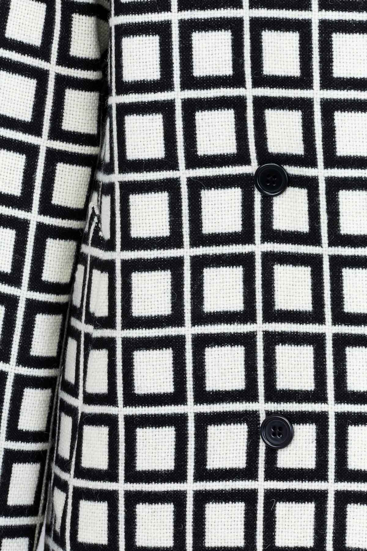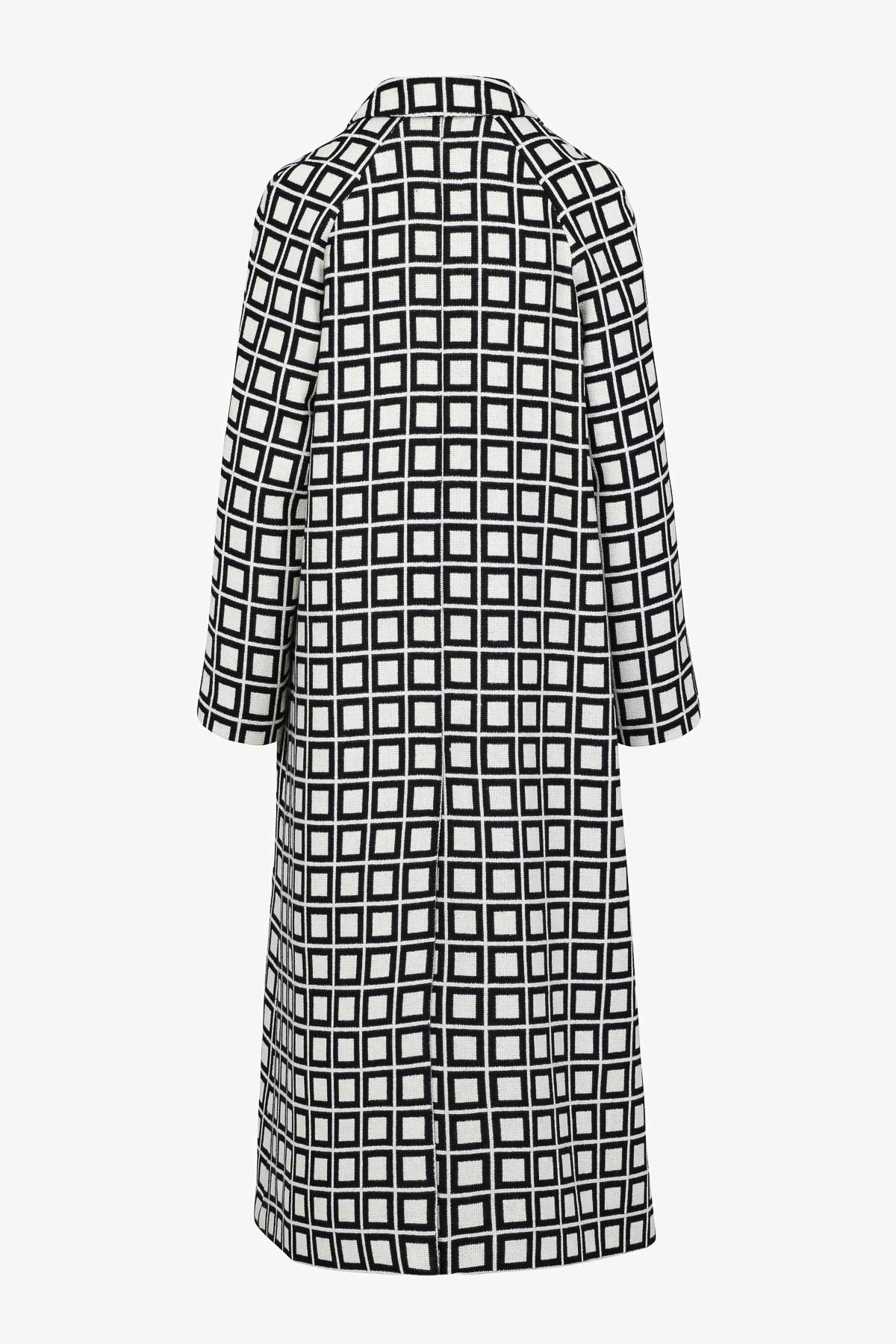 Double breasted short coat with band collar in black and white patterned virgin wool.