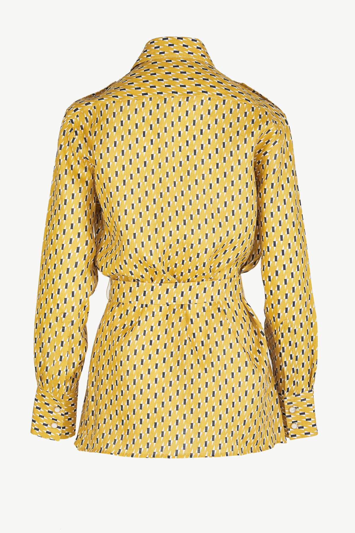 Handmade long sleeved safari shirt with fabric belt in printed linen.