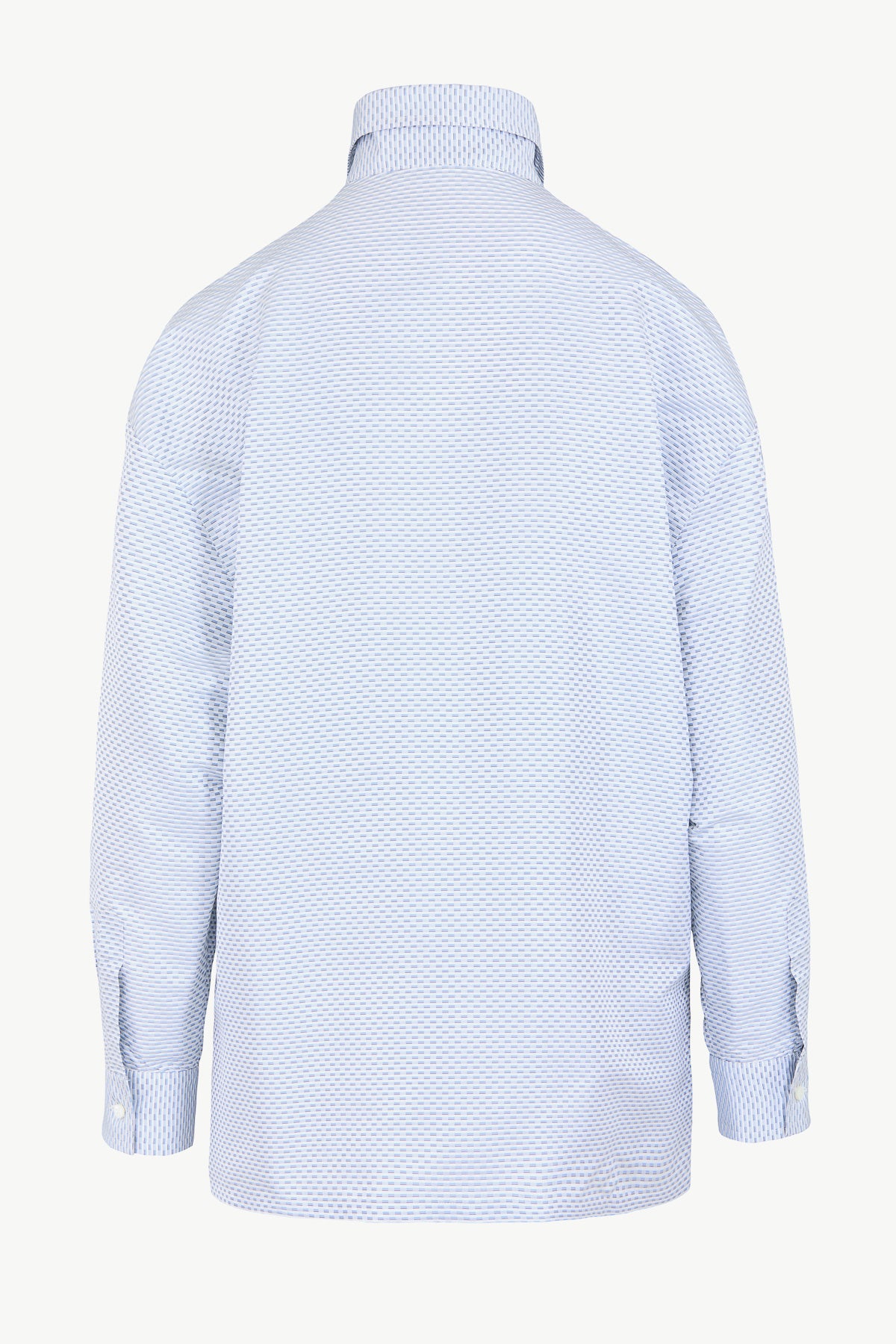 A feminine take on classic shirting, the Savannah shirt is tailored in an elegant jacquard silk, woven in a delicate interplay of light blue, grey, and white. The straight cut and dropped shoulders lend a relaxed yet refined silhouette, while the wide French cuffs and sharp collar nod to traditional men's tailoring.  Subtle from afar, yet rich in texture and detail up close, this shirt is designed to elevate the everyday. Wear it tucked into skirts or trousers, or open over a camisole for a more nonchalant look.