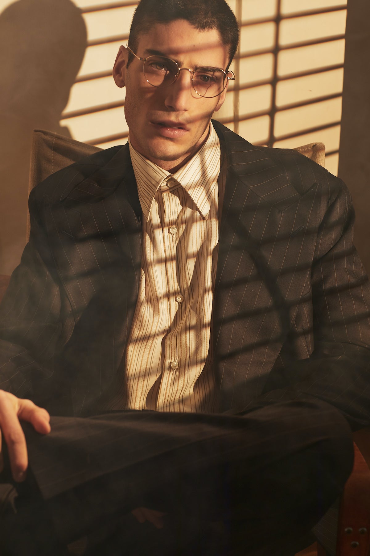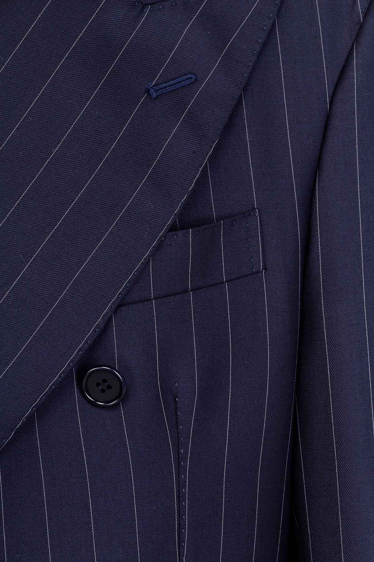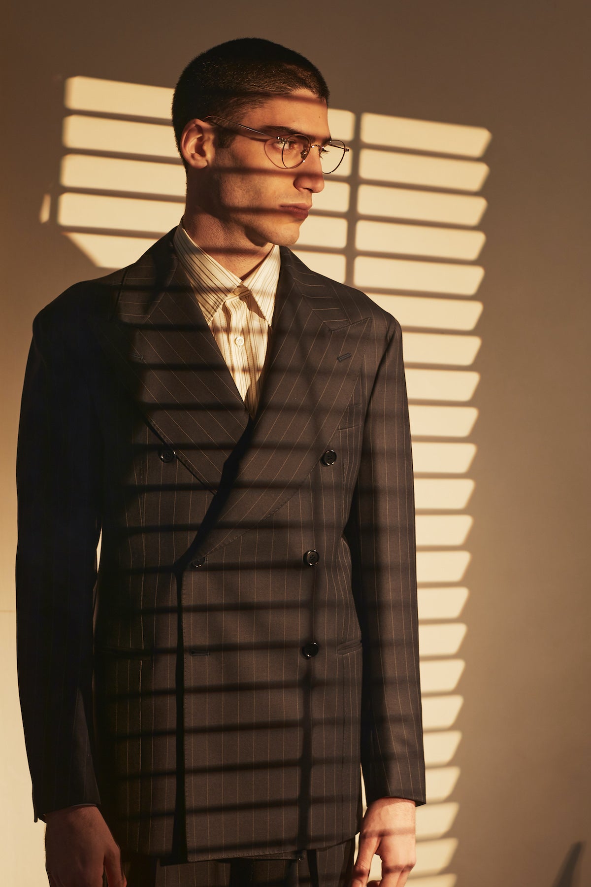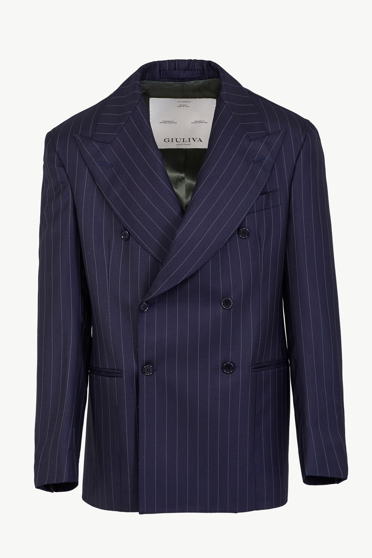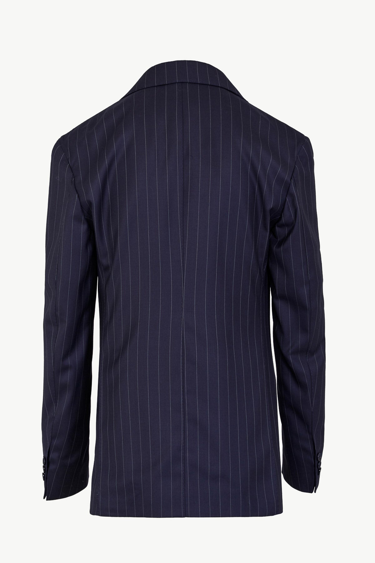 Hand tailored, double-breasted blazer in wool pinstripe with peak lapel, six buttons, besom pockets and comfortable fit